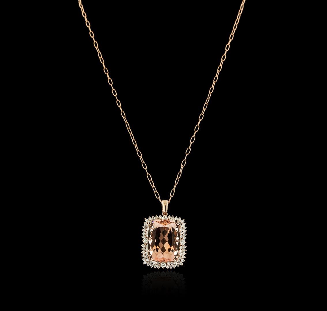 One electronically tested 14KT rose gold ladies cast morganite and diamond pendant & chain 18.0" long, cable link with a lobster claw clasp with a bright polish finish. Identified with markings of "14K". Condition is new. Containing: One prong set rectangular cushion modified mixed cut natural morganite, measuring 24.27 x 18.68 x 12.60mm, approximate weight of 36.51ct., clarity is eye clean, type I, light, brownish, reddish orange color, (GIA rO 3/1), cut is good. Four prong set round brilliant cut diamonds, measuring 3.30 - 3.30 x 1.98mm (depth est.) approximate total weight of 4 Stones = 0.53ct. Clarity: SI-1 to I-1. Color: I - J, Cut is Good. Seventy-Two prong set round brilliant cut diamonds, measuring 1.80 - 1.80 x 1.08mm (depth est.) approximate total weight of 72 Stones = 1.53ct. Clarity: SI-1 to SI-2. Color: I - J, Cut is Good. Colored gemstones are presumed to have been subjected to commonly used enhancement processes. All diamonds and colored gemstones are graded in the mounting, unless otherwise stated. Total Weight of Colored Stones 36.51ct. Total Weight of Diamonds 2.06ct. Total Weight of Pendant & Chain 24.60 grams. GGL Appraised at $13,165.00.