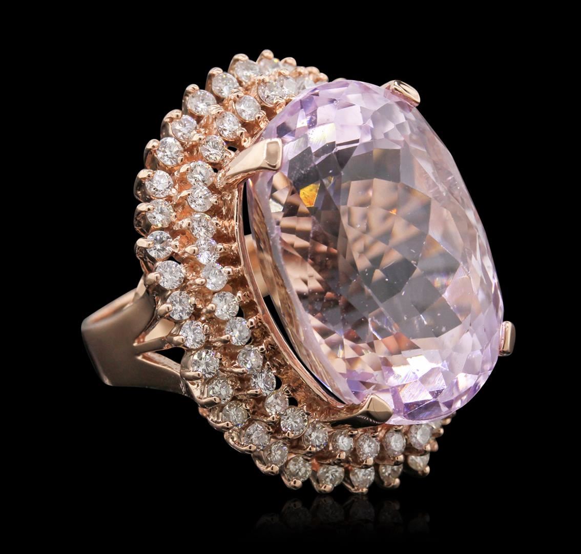 One electronically tested 14KT rose gold ladies cast kunzite and diamond ring with a bright polish finish. Condition is new, good workmanship. The featured kunzite is set within two stylized tiered diamond bezels supported by split shoulders, completed by a four millimeter wide band. Identified with markings of "K14". Containing: One prong set oval modified brilliant cut natural kunzite, measuring 23.29 x 16.31 x 13.19mm, exact weight 39.46ct., type I Clarity is slightly included, medium, very slightly grayish, Purple-Pink, (GIA PPi 5/3), cut is good. Transmitting light with no distortion, transparent. Naturally occurring internal & external characteristics are present. GIA Gemological Report attached. Graded loose prior to setting in the GIA Laboratory, Report #6157953494.Seventy-Three prong set round brilliant cut diamonds, measuring 1.90 - 1.80 x 1.11mm (depth est.) approximate. Total Weight of 73 Stones = 1.78ct. Graded in the setting. Clarity: SI-1 to I-1. Color: G - I. Total Weight of Colored Stones 39.46ct. Total Weight of Diamonds 1.78ct. Total Weight of Ring 19.46 grams. AIG Appraised at $19,015.00.