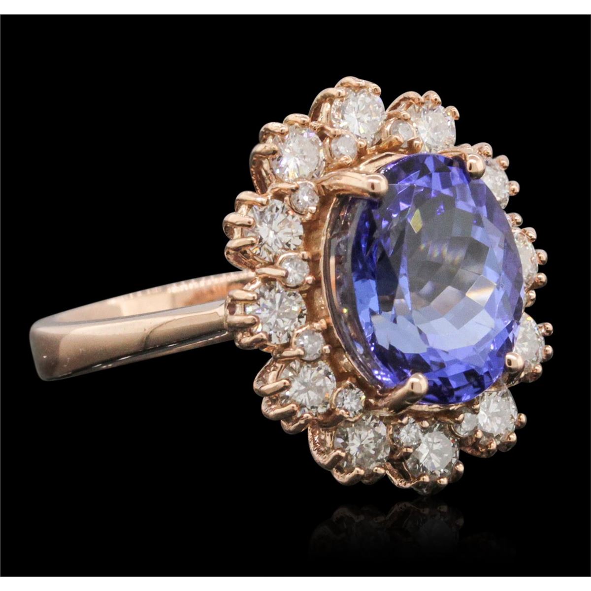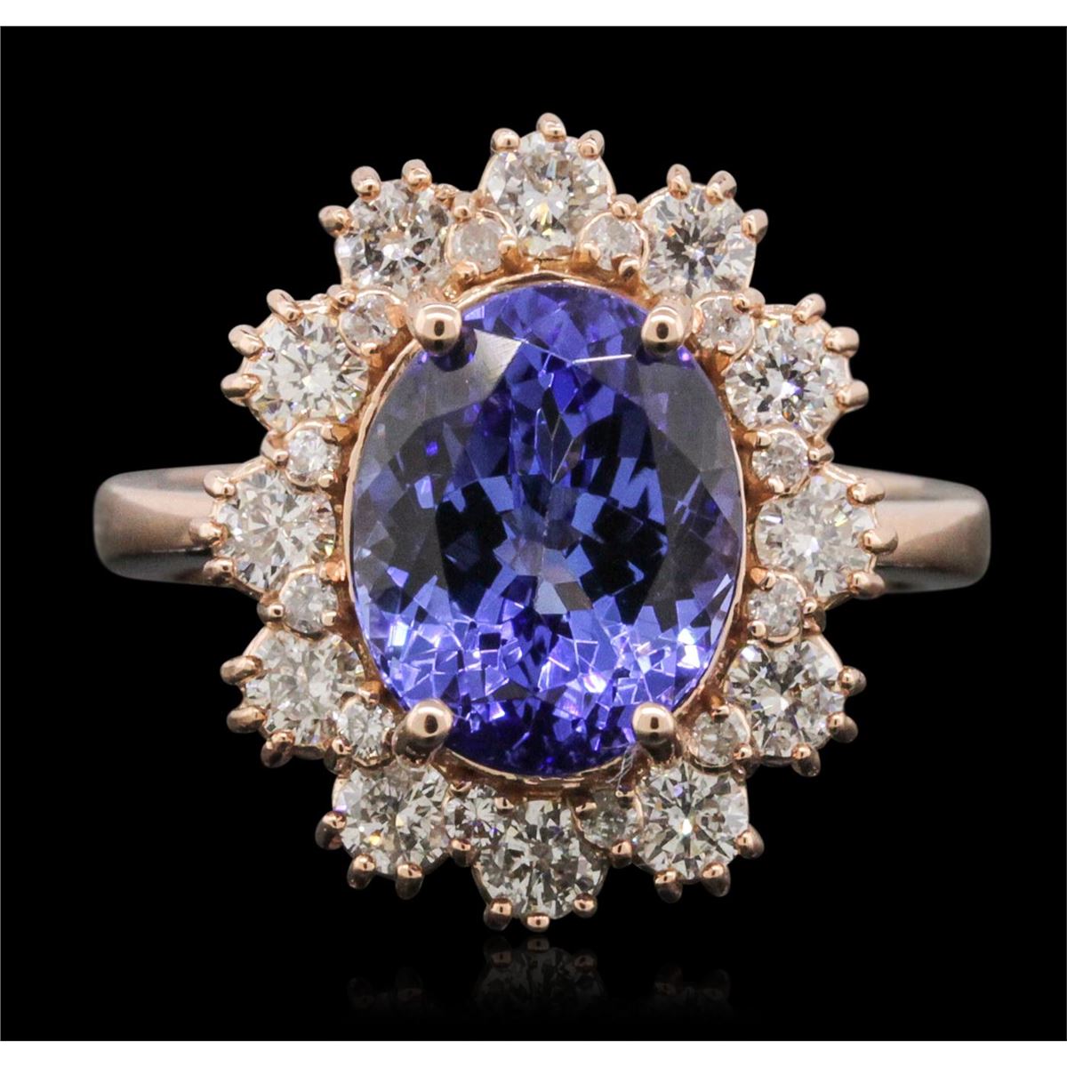One electronically tested 14KT rose gold ladies combination cast & assembled ring with a bright polish finish. Condition is new. Identified with markings of "K14". Containing: One prong set oval modified brilliant cut natural tanzanite, measuring 10.67 x 8.50 x 6.56mm, approximate weight of 4.04ct., clarity is eye clean, type I, medium, moderately strong, bluish violet color, (GIA bV 5/4), cut is good. Twelve prong set round brilliant cut diamonds, measuring 2.50 - 2.50 x 1.50mm (depth est.) approximate. Total Weight of 12 Stones = 0.69ct. Clarity: SI-1 to SI-2. Color: K - L, Cut is Good. Twelve prong set round brilliant cut diamonds, measuring 1.30 - 1.30 x 0.78mm (depth est.) approximate. Total Weight of 12 Stones = 0.10ct. Clarity: I-2. Color: H - I, Cut is Good. Colored gemstones are presumed to have been subjected to commonly used enhancement processes. All diamonds and colored gemstones are graded in the mounting, unless otherwise stated. Total Weight of Colored Stones 4.04ct. Total Weight of Diamonds 0.78ct. Total Weight of Ring 6.20 grams. GGL Appraised at $9,555.00.