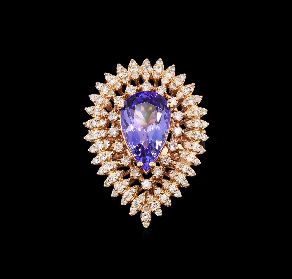 One electronically tested 14KT rose gold ladies cast tanzanite and diamond ring with a bright polish finish. Identified with markings of "K14". Condition is new. Containing: One prong set pear modified brilliant cut natural tanzanite, measuring 13.80 x 8.20 x 5.34mm, approximate weight of 4.05ct., clarity is eye clean, type I, medium light, very slightly grayish, violet color, (GIA V 4/3), cut is good. One Hundred Twelve prong set round brilliant cut diamonds, measuring 1.30 - 1.20 x 0.75mm (depth est.) approximate. total weight of 112 Stones = 0.80ct. Clarity: SI-1 to I-1. Color: I - J, Cut is Good. Colored gemstones are presumed to have been subjected to commonly used enhancement processes. All diamonds and colored gemstones are graded in the mounting, unless otherwise stated. Total Weight of Colored Stones 4.05ct. Total Weight of Diamonds 0.80ct. Total Weight of Ring 8.70 grams. GGL Appraised at $5,665.00.
