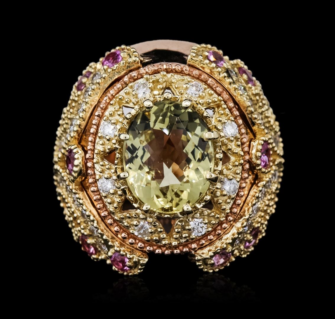 One electronically tested 14KT rose gold ladies combination cast & assembled citrine, amethyst and diamond ring with a bright polish finish. Condition is new. Containing: One prong set oval modified mixed cut natural citrine quartz, measuring 12.45 x 8.95 x 6.50mm, approximate weight of 4.05ct., clarity is eye clean, type I, medium light, brownish, yellowish green color, (GIA Y 4/3), cut is good. Ten gypsy set round modified brilliant cut natural amethysts, measuring 3.00 - 3.00 x 1.95 mm, approximate total weight of 0.90ct., clarity is eye clean, type II, medium, moderately strong, purple color, (GIA P 5/4), cut is good. Seventy prong set round brilliant cut diamonds, measuring 2.00 - 2.00 x 1.20mm (depth est.) approximate total weight of 70 Stones = 2.04ct. Clarity: SI-2 to I-1. Color: I - J, Cut is Good. Colored gemstones are presumed to have been subjected to commonly used enhancement processes. All diamonds and colored gemstones are graded in the mounting, unless otherwise stated. Total Weight of Colored Stones 4.95ct. Total Weight of Diamonds 2.04ct. Total Weight of Ring 21.50 grams. GGL Appraised at $7,855.00.