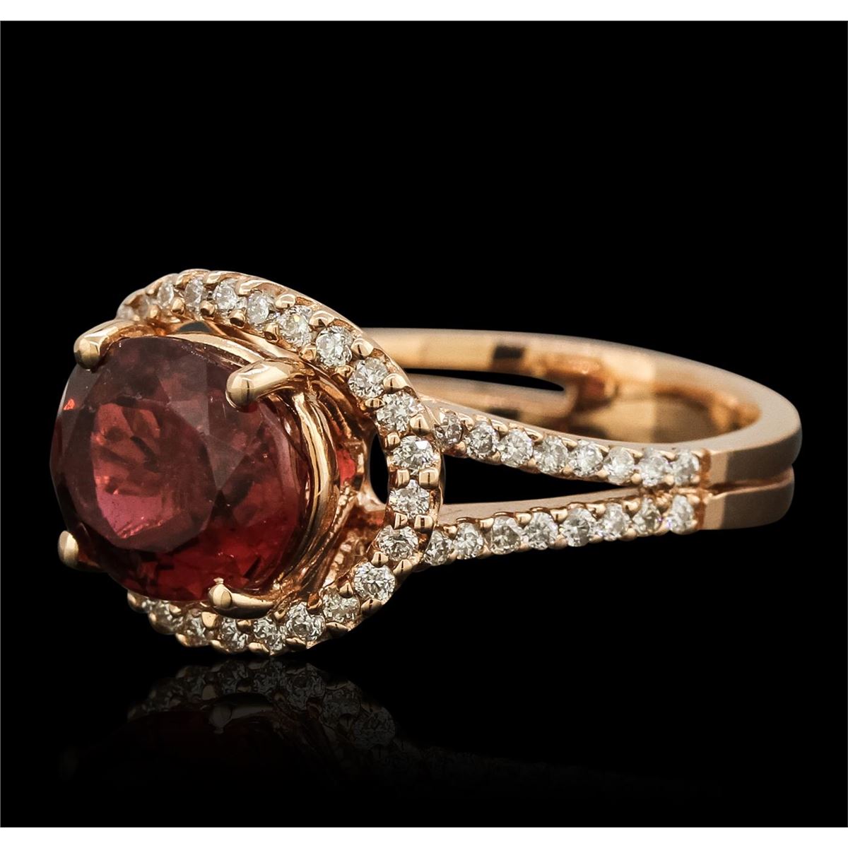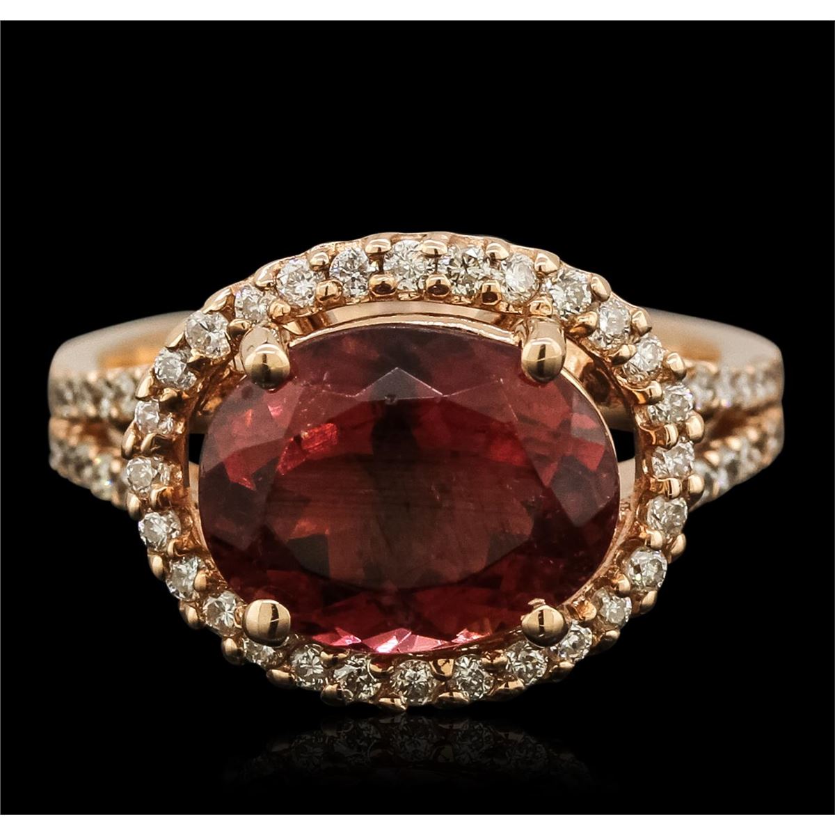 One electronically tested 14KT rose gold ladies cast rubellite tourmaline and diamond ring with a bright polish finish. The featured rubellite tourmaline is set within a diamond bezel supported by diamond set shoulders, completed by a three millimeter wide band. Condition is new, good workmanship. Containing: One prong set oval mixed cut natural rubellite, measuring 11.30 x 8.90 x 6.20mm, 6%. bulge factor, approximate weight of 4.10ct., clarity is slightly included, type III, dark, very slightly brownish, slightly purplish red color, (GIA slpR 7/3), cut is good. Transmitting light with a minimum of distortion, transparent. Naturally occurring internal & external characteristics are present. Graded in the setting. Sixty prong set round brilliant cut diamonds, measuring 1.40 - 1.30 x 0.81mm (depth est.) approximate. Total Weight of 60 Stones = 0.64ct. Graded in the setting. Clarity: SI-1 to I-1. Color: G - I. Total Weight of Colored Stones 4.10ct. Total Weight of Diamonds 0.64ct. Total Weight of Ring 6.90gm. AIG Appraised at $6,045.00.