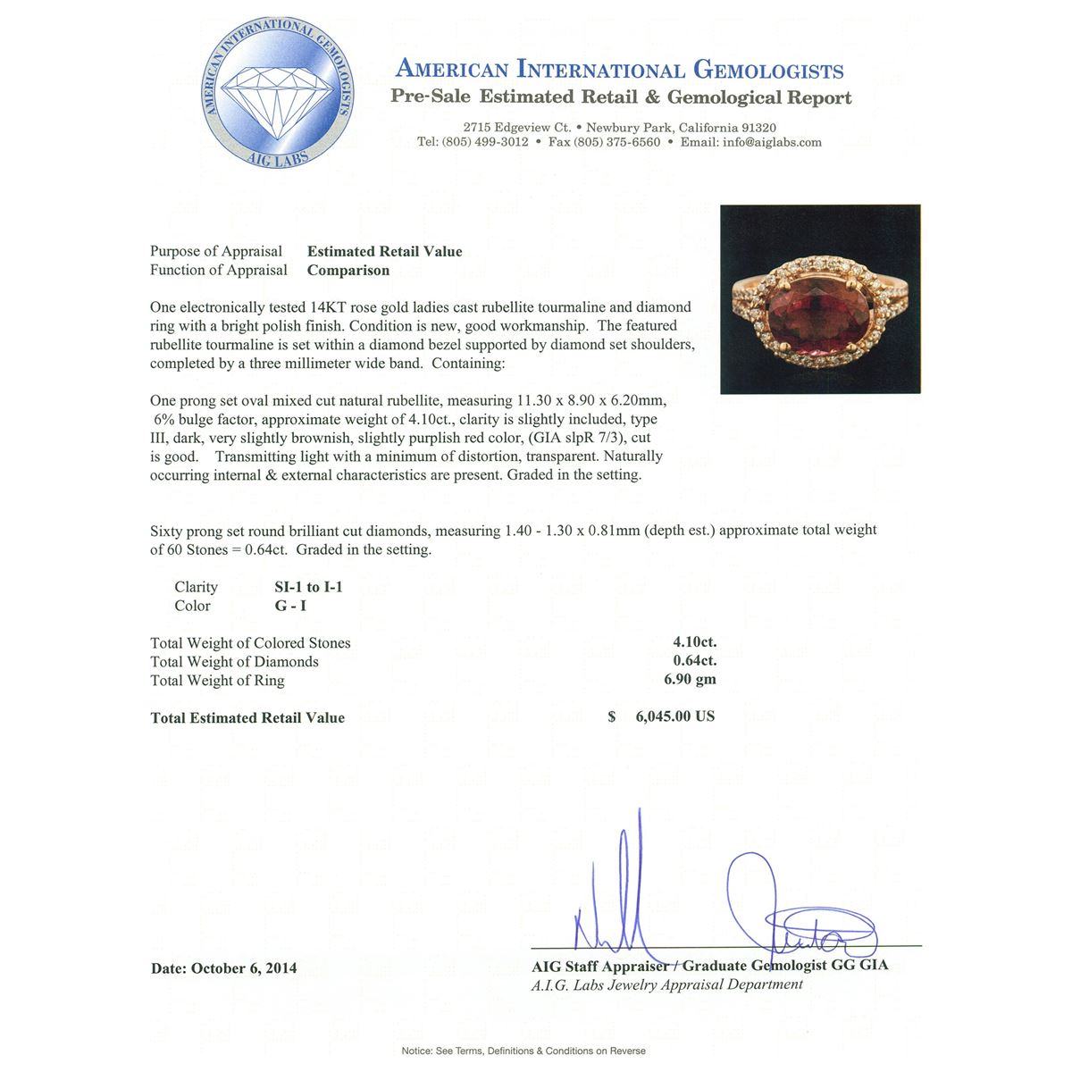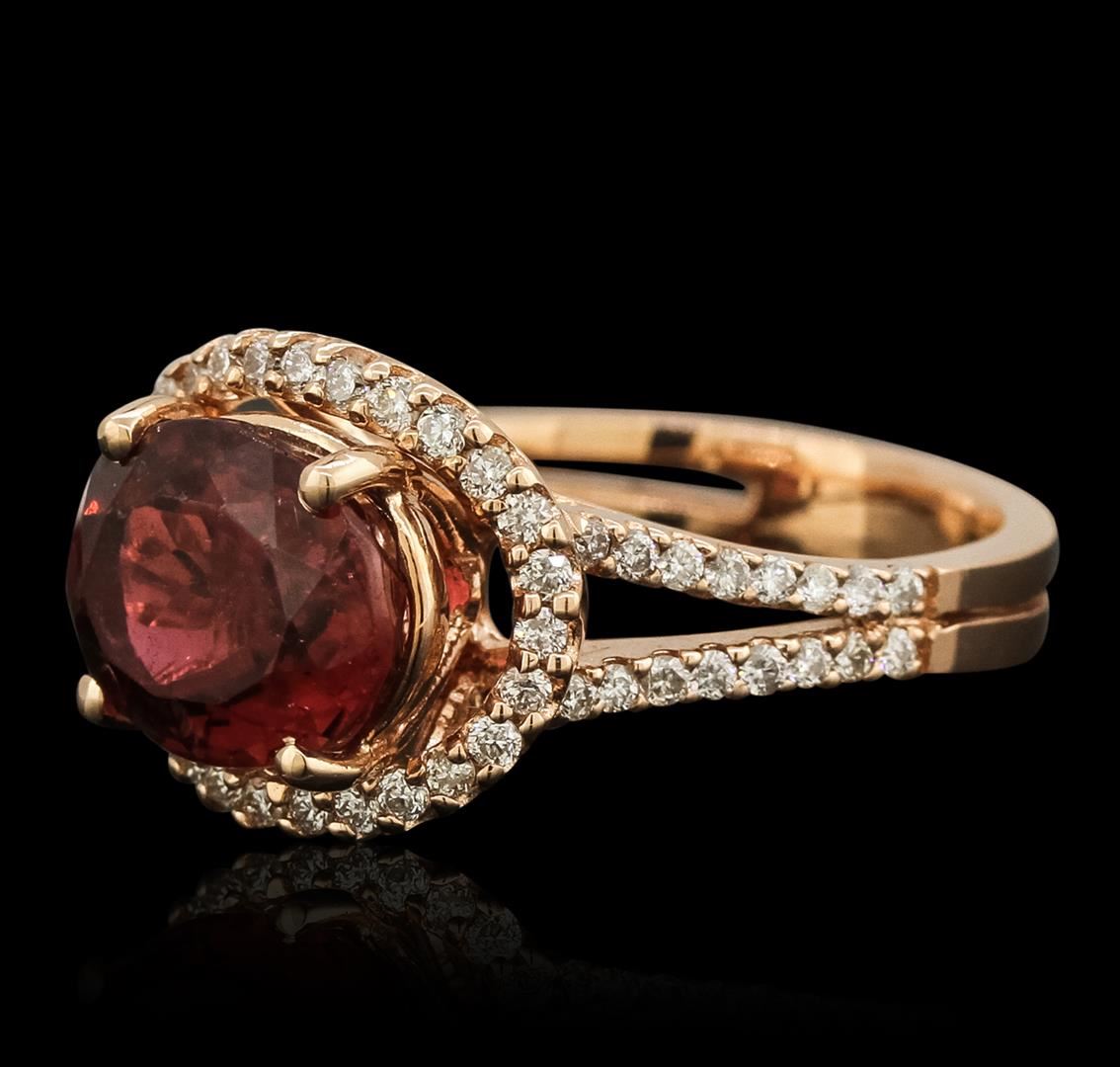 One electronically tested 14KT rose gold ladies cast rubellite tourmaline and diamond ring with a bright polish finish. The featured rubellite tourmaline is set within a diamond bezel supported by diamond set shoulders, completed by a three millimeter wide band. Condition is new, good workmanship. Containing: One prong set oval mixed cut natural rubellite, measuring 11.30 x 8.90 x 6.20mm, 6%. bulge factor, approximate weight of 4.10ct., clarity is slightly included, type III, dark, very slightly brownish, slightly purplish red color, (GIA slpR 7/3), cut is good. Transmitting light with a minimum of distortion, transparent. Naturally occurring internal & external characteristics are present. Graded in the setting. Sixty prong set round brilliant cut diamonds, measuring 1.40 - 1.30 x 0.81mm (depth est.) approximate. Total Weight of 60 Stones = 0.64ct. Graded in the setting. Clarity: SI-1 to I-1. Color: G - I. Total Weight of Colored Stones 4.10ct. Total Weight of Diamonds 0.64ct. Total Weight of Ring 6.90gm. AIG Appraised at $6,045.00.