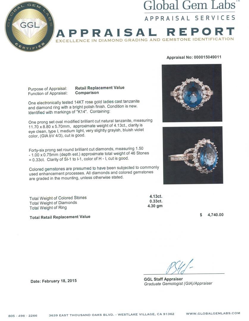 One electronically tested 14KT rose gold ladies cast tanzanite and diamond ring with a bright polish finish. Identified with markings of "K14". Condition is new. Containing: One prong set oval modified brilliant cut natural tanzanite, measuring 11.70 x 8.80 x 5.70mm, approximate weight of 4.13ct., clarity is eye clean, type I, medium light, very slightly grayish, bluish violet color, (GIA bV 4/3), cut is good. Forty-Six prong set round brilliant cut diamonds, measuring 1.50 - 1.00 x 0.75mm (depth est.) approximate total weight of 46 Stones = 0.33ct. Clarity: SI-1 to I-1. Color: H - I, Cut is Good. Colored gemstones are presumed to have been subjected to commonly used enhancement processes. All diamonds and colored gemstones are graded in the mounting, unless otherwise stated. Total Weight of Colored Stones 4.13ct. Total Weight of Diamonds 0.33ct. Total Weight of Ring 4.30 grams. GGL Appraised at $4,740.00.