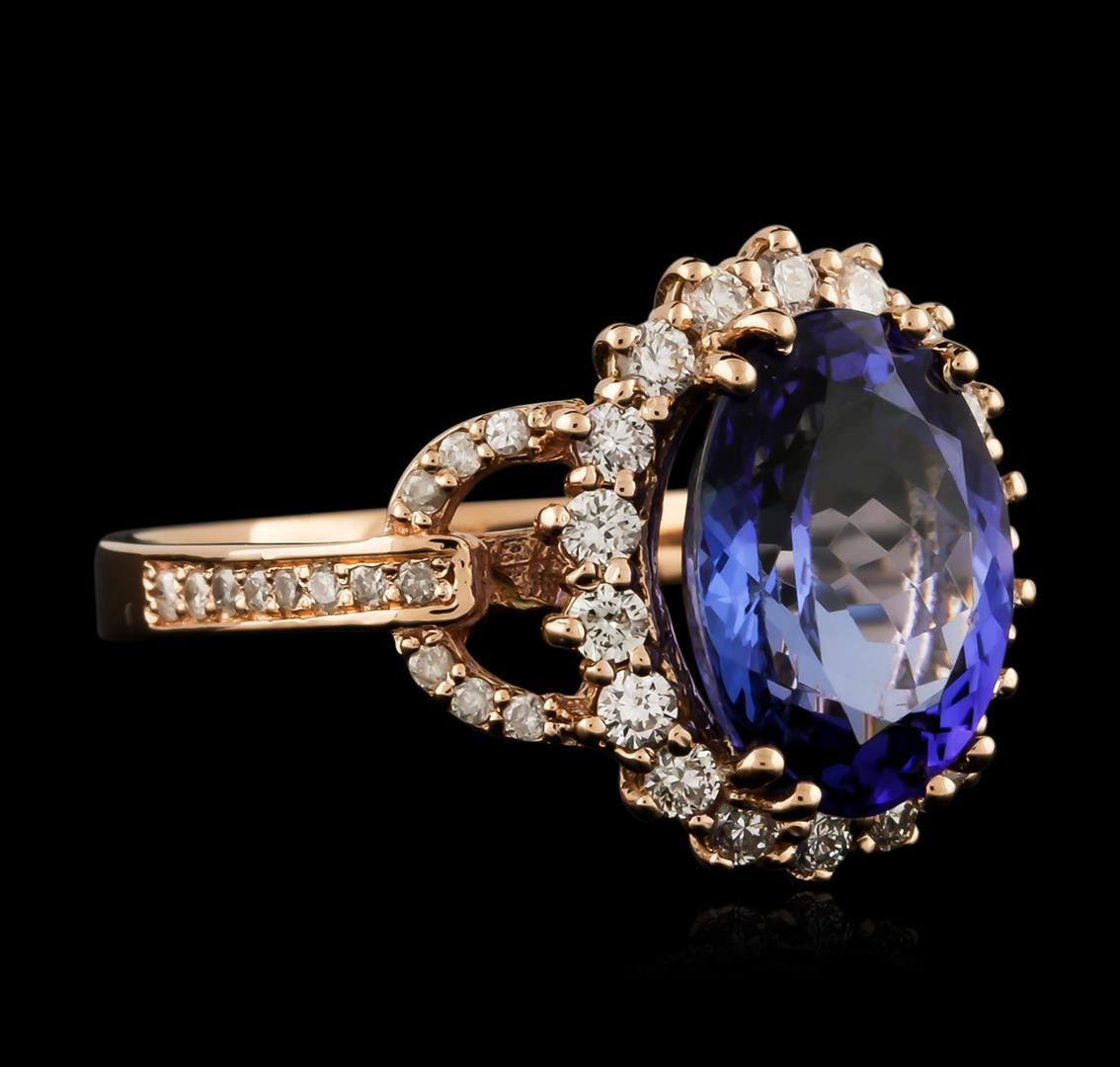 One electronically tested 14KT rose gold ladies cast tanzanite and diamond ring with a bright polish finish. Identified with markings of "K14". Condition is new. Containing: One prong set oval modified brilliant cut natural tanzanite, measuring 11.70 x 8.80 x 5.70mm, approximate weight of 4.13ct., clarity is eye clean, type I, medium light, very slightly grayish, bluish violet color, (GIA bV 4/3), cut is good. Forty-Six prong set round brilliant cut diamonds, measuring 1.50 - 1.00 x 0.75mm (depth est.) approximate total weight of 46 Stones = 0.33ct. Clarity: SI-1 to I-1. Color: H - I, Cut is Good. Colored gemstones are presumed to have been subjected to commonly used enhancement processes. All diamonds and colored gemstones are graded in the mounting, unless otherwise stated. Total Weight of Colored Stones 4.13ct. Total Weight of Diamonds 0.33ct. Total Weight of Ring 4.30 grams. GGL Appraised at $4,740.00.