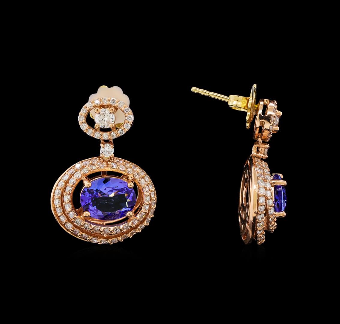 One pair electronically tested Gold-Rose-14KT ladies cast tanzanite and diamond earrings with friction posts with a bright polish finish. Identified with markings of "585". Condition is new. Containing: Two prong set oval modified brilliant cut natural tanzanites, measuring 9.50 x 7.00. x 4.55mm, approximate total weight of 4.26ct., clarity is eye clean, type I, medium light, very slightly grayish, violet color, (GIA V 4/3), cut is good. Two prong set round brilliant cut diamonds, measuring 3.00. - 3.00. x 1.80mm (depth est.) approximate total weight of 2 Stones = 0.20ct. Clarity: SI-1 to SI. Color: J, Cut is Good. Two prong set round brilliant cut diamonds, measuring 2.10 - 2.10 x 1.26mm (depth est.) approximate total weight of 2 Stones = 0.07ct. Clarity: SI-1 to SI-2. Color: I - J. One Hundred Forty prong set round brilliant cut diamonds, measuring 1.30 - 1.30 x 0.78mm (depth est.) approximate total weight of 140 Stones = 1.12ct. Clarity: SI-2 to I-1. Color: I - J. Colored gemstones are presumed to have been subjected to commonly used enhancement processes. All diamonds and colored gemstones are graded in the mounting, unless otherwise stated. Total Weight of Colored Stones 4.26ct. Total Weight of Diamonds 1.39ct. Total Weight of Earrings 8.40 grams. GGL Appraised at $5,600.00.