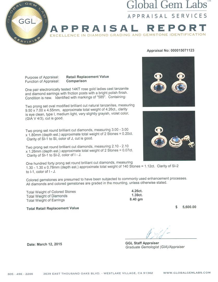 One pair electronically tested Gold-Rose-14KT ladies cast tanzanite and diamond earrings with friction posts with a bright polish finish. Identified with markings of "585". Condition is new. Containing: Two prong set oval modified brilliant cut natural tanzanites, measuring 9.50 x 7.00. x 4.55mm, approximate total weight of 4.26ct., clarity is eye clean, type I, medium light, very slightly grayish, violet color, (GIA V 4/3), cut is good. Two prong set round brilliant cut diamonds, measuring 3.00. - 3.00. x 1.80mm (depth est.) approximate total weight of 2 Stones = 0.20ct. Clarity: SI-1 to SI. Color: J, Cut is Good. Two prong set round brilliant cut diamonds, measuring 2.10 - 2.10 x 1.26mm (depth est.) approximate total weight of 2 Stones = 0.07ct. Clarity: SI-1 to SI-2. Color: I - J. One Hundred Forty prong set round brilliant cut diamonds, measuring 1.30 - 1.30 x 0.78mm (depth est.) approximate total weight of 140 Stones = 1.12ct. Clarity: SI-2 to I-1. Color: I - J. Colored gemstones are presumed to have been subjected to commonly used enhancement processes. All diamonds and colored gemstones are graded in the mounting, unless otherwise stated. Total Weight of Colored Stones 4.26ct. Total Weight of Diamonds 1.39ct. Total Weight of Earrings 8.40 grams. GGL Appraised at $5,600.00.