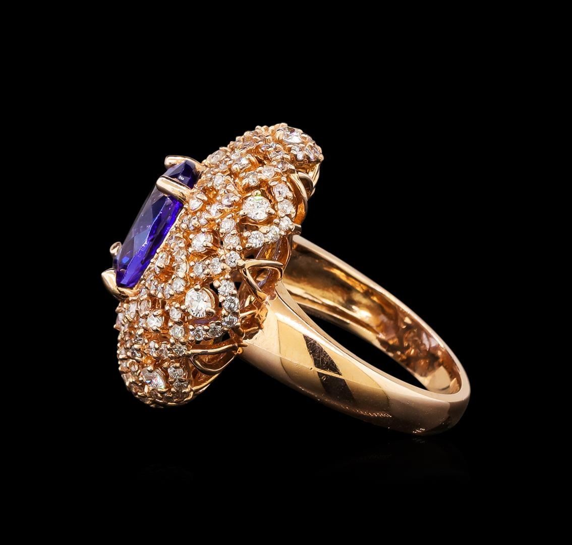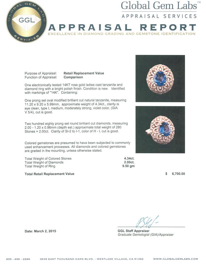 One electronically tested 14KT rose gold ladies cast tanzanite and diamond ring with a bright polish finish. Identified with markings of "14K". Condition is new. Containing: One prong set oval modified brilliant cut natural tanzanite, measuring 11.20 x 9.20 x 5.99mm, approximate weight of 4.34ct., clarity is eye clean, type I, medium, moderately strong, violet color, (GIA V 5/4), cut is good. Two Hundred Eighty prong set round brilliant cut diamonds, measuring 2.00 - 1.20 x 0.96mm (depth est.) approximate total weight of 280 Stones = 2.00 ct. Clarity: SI-2 to I-1. Color: H - I, Cut is Good. Colored gemstones are presumed to have been subjected to commonly used enhancement processes. All diamonds and colored gemstones are graded in the mounting, unless otherwise stated. Total Weight of Colored Stones 4.34ct. Total Weight of Diamonds 2.00 ct. Total Weight of Ring 9.50 grams. GGL Appraised.