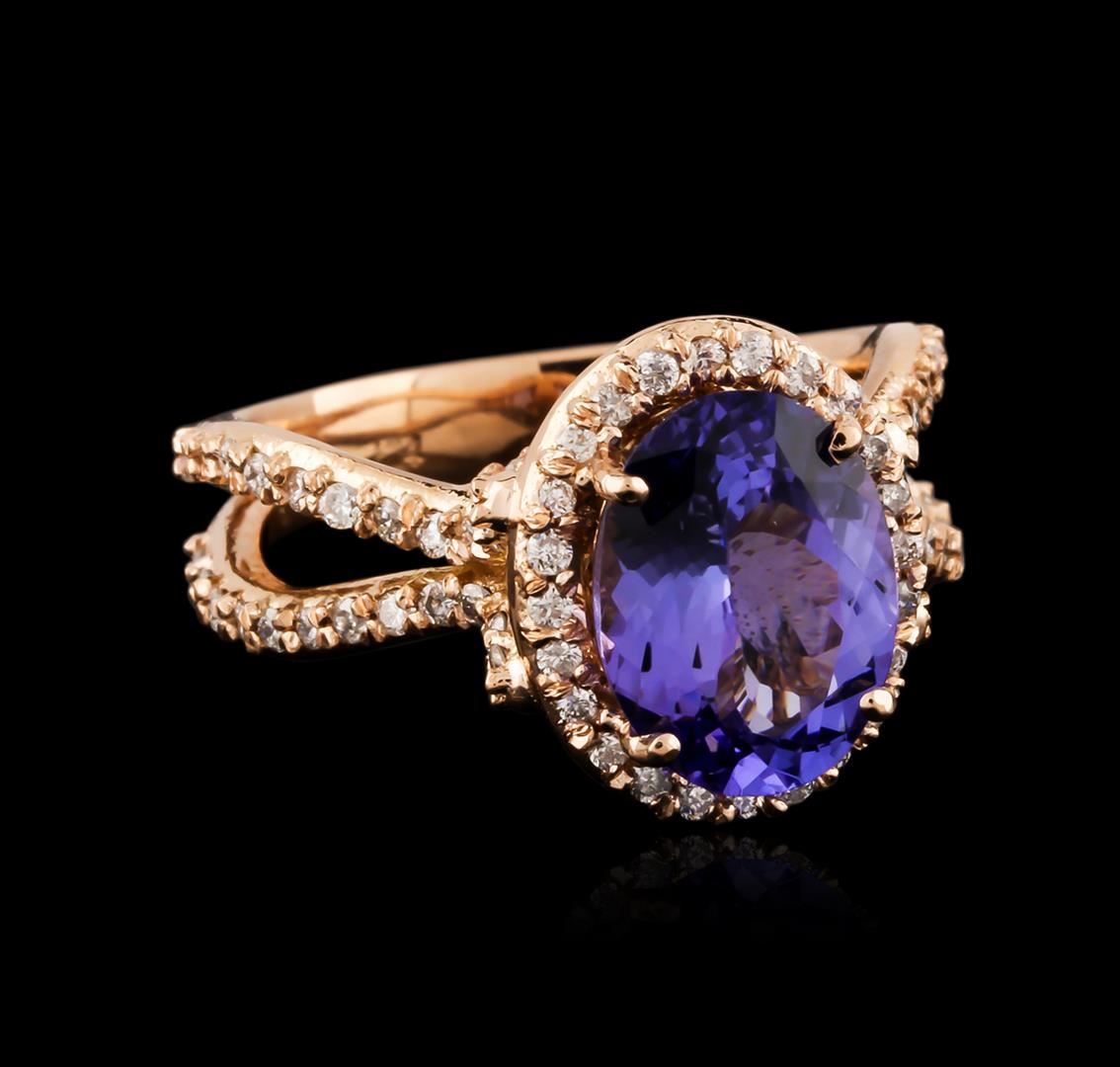 One electronically tested 14KT rose gold ladies cast tanzanite and diamond ring with a bright polish finish. Identified with markings of "14K". Condition is new. Containing: One prong set oval oval modified brilliant cut natural tanzanite, measuring 10.90 x 8.27 x 6.84mm, approximate weight of 4.34ct., clarity is eye clean, type I, medium light, very slightly grayish, violet color, (GIA V 4/3), cut is good. Ninety prong set round brilliant cut diamonds, measuring 1.20 - 1.20 x 0.72mm (depth est.) approximate total weight of 90 Stones = 0.57ct. Clarity: SI-2 to I-2. Color: J - K, Cut is Good. Colored gemstones are presumed to have been subjected to commonly used enhancement processes. All diamonds and colored gemstones are graded in the mounting, unless otherwise stated. Total Weight of Colored Stones 4.34ct. Total Weight of Diamonds 0.57ct. Total Weight of Ring 6.50 grams. GGL Appraised at $4,545.00.