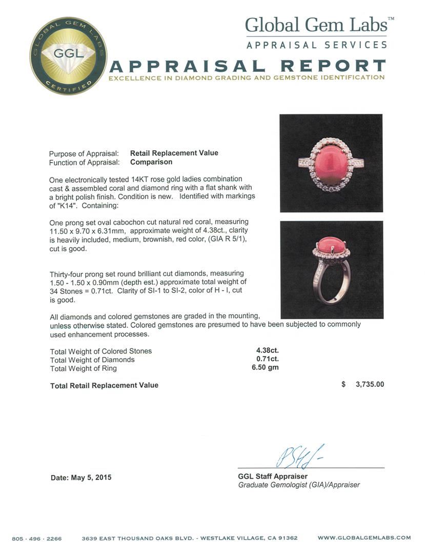 One electronically tested 14KT rose gold ladies combination cast & assembled coral and diamond ring with a flat shank with a bright polish finish. Identified with markings of "K14". Condition is new. Containing: One prong set oval cabochon cut natural red coral, measuring 11.50 x 9.70 x 6.31mm, approximate weight of 4.38ct., clarity is heavily included, medium, brownish, red color, (GIA R 5/1), cut is good. Thirty-Four prong set round brilliant cut diamonds, measuring 1.50 - 1.50 x 0.90mm (depth est.) approximate total weight of 34 Stones = 0.71ct. Clarity: SI-1 to SI-2. Color: H - I, Cut is Good. All diamonds and colored gemstones are graded in the mounting, unless otherwise stated. Colored gemstones are presumed to have been subjected to commonly used enhancement processes.. Total Weight of Colored Stones 4.38ct. Total Weight of Diamonds 0.71ct. Total Weight of Ring 6.50 grams. GGL Appraised at $3,735.00.