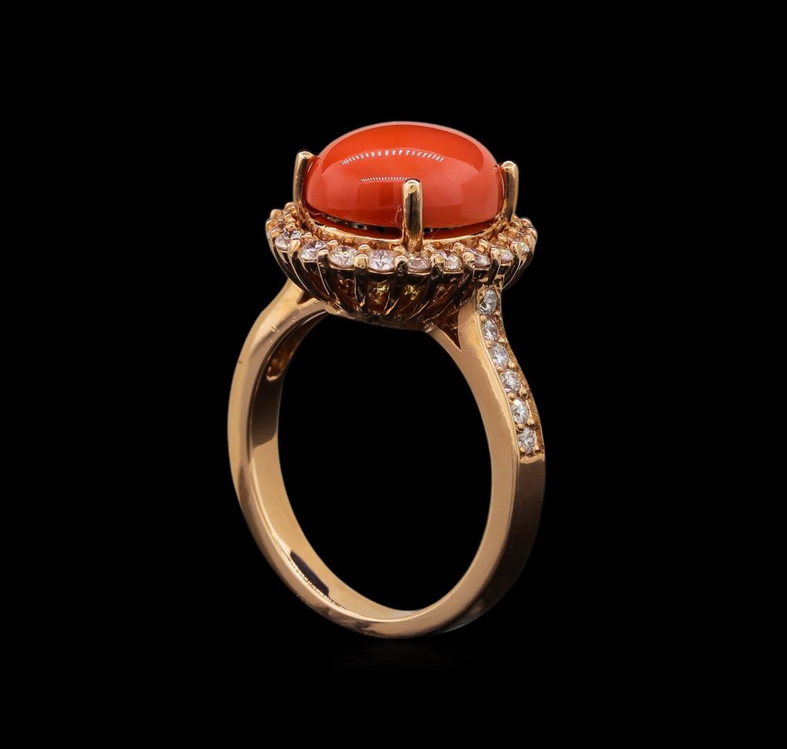 One electronically tested 14KT rose gold ladies combination cast & assembled coral and diamond ring with a flat shank with a bright polish finish. Identified with markings of "K14". Condition is new. Containing: One prong set oval cabochon cut natural red coral, measuring 11.50 x 9.70 x 6.31mm, approximate weight of 4.38ct., clarity is heavily included, medium, brownish, red color, (GIA R 5/1), cut is good. Thirty-Four prong set round brilliant cut diamonds, measuring 1.50 - 1.50 x 0.90mm (depth est.) approximate total weight of 34 Stones = 0.71ct. Clarity: SI-1 to SI-2. Color: H - I, Cut is Good. All diamonds and colored gemstones are graded in the mounting, unless otherwise stated. Colored gemstones are presumed to have been subjected to commonly used enhancement processes.. Total Weight of Colored Stones 4.38ct. Total Weight of Diamonds 0.71ct. Total Weight of Ring 6.50 grams. GGL Appraised at $3,735.00.