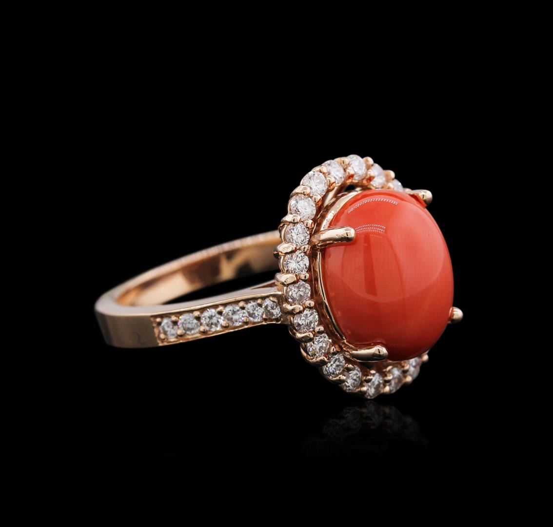 One electronically tested 14KT rose gold ladies combination cast & assembled coral and diamond ring with a flat shank with a bright polish finish. Identified with markings of "K14". Condition is new. Containing: One prong set oval cabochon cut natural red coral, measuring 11.50 x 9.70 x 6.31mm, approximate weight of 4.38ct., clarity is heavily included, medium, brownish, red color, (GIA R 5/1), cut is good. Thirty-Four prong set round brilliant cut diamonds, measuring 1.50 - 1.50 x 0.90mm (depth est.) approximate total weight of 34 Stones = 0.71ct. Clarity: SI-1 to SI-2. Color: H - I, Cut is Good. All diamonds and colored gemstones are graded in the mounting, unless otherwise stated. Colored gemstones are presumed to have been subjected to commonly used enhancement processes.. Total Weight of Colored Stones 4.38ct. Total Weight of Diamonds 0.71ct. Total Weight of Ring 6.50 grams. GGL Appraised at $3,735.00.