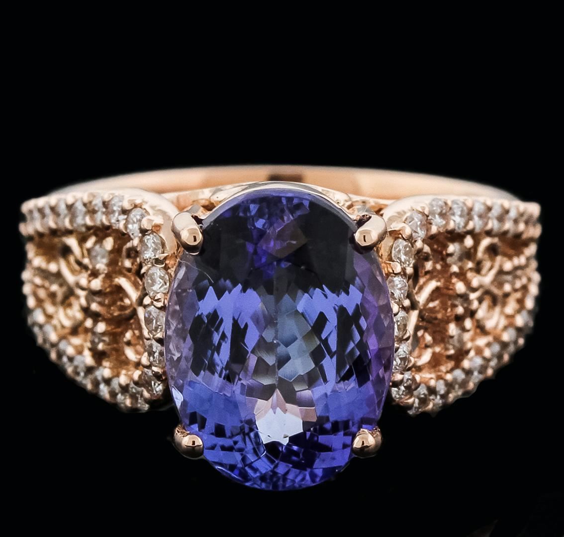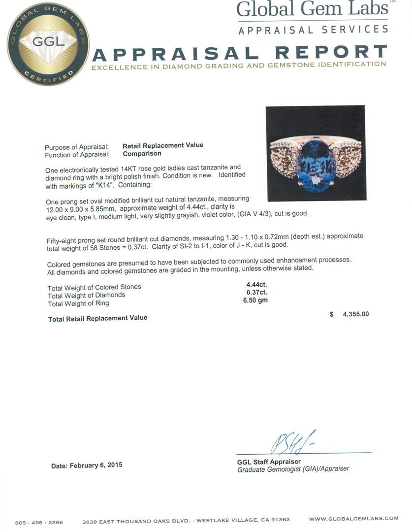 One electronically tested 14KT rose gold ladies cast tanzanite and diamond ring with a bright polish finish. Identified with markings of "K14". Condition is new. Containing: One prong set oval modified brilliant cut natural tanzanite, measuring 12.00 x 9.00 x 5.85mm, approximate weight of 4.44ct., clarity is eye clean, type I, medium light, very slightly grayish, violet color, (GIA V 4/3), cut is good. Fifty-Eight prong set round brilliant cut diamonds, measuring 1.30 - 1.10 x 0.72mm (depth est.) approximate. Total Weight of 58 Stones = 0.37ct. Clarity: SI-2 to I-1. Color: J - K, Cut is Good. Colored gemstones are presumed to have been subjected to commonly used enhancement processes. All diamonds and colored gemstones are graded in the mounting, unless otherwise stated. Total Weight of Colored Stones 4.44ct. Total Weight of Diamonds 0.37ct. Total Weight of Ring 6.50 grams. GGL Appraised at $4,355.00.