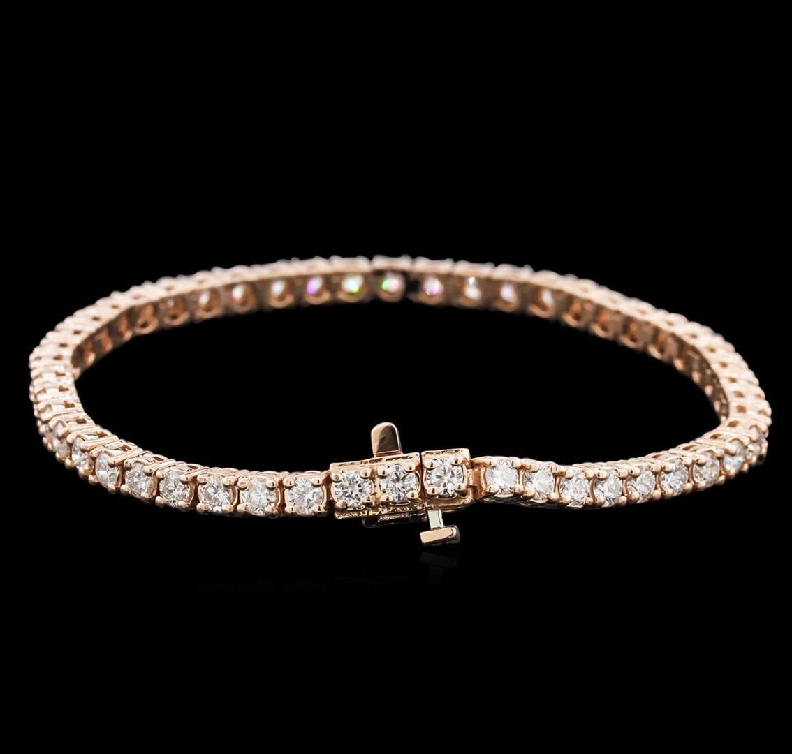 One electronically tested 14KT rose gold ladies cast diamond tennis bracelet with a hidden box clasp with safety closer with a bright polish finish. Measurements: 7" in length Identified with markings of "14K". Condition is new. Containing: Fifty-One prong set round brilliant cut diamonds, measuring 2.90 - 2.90 x 1.74mm (depth est.) approximate total weight of 51 Stones = 4.65ct. Clarity: I-1 to I-2. Color: I - J, Cut is Good. Diamonds are graded in the mounting, unless otherwise stated. Total Weight of Diamonds 4.65ct. Total Weight of Tennis Bracelet 13.80 grams. GGL Appraised at $7,225.00.