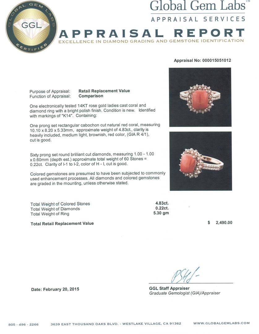 One electronically tested 14KT rose gold ladies cast coral and diamond ring with a bright polish finish. Identified with markings of "K14". Condition is new. Containing: One prong set rectangular cabochon cut natural red coral, measuring 10.10 x 8.20 x 5.33mm, approximate weight of 4.83ct., clarity is heavily included, medium light, brownish, red color, (GIA R 4/1), cut is good. Sixty prong set round brilliant cut diamonds, measuring 1.00 - 1.00 x 0.60mm (depth est.) approximate total weight of 60 Stones = 0.22ct. Clarity: I-1 to I-2. Color: H - I, Cut is Good. Colored gemstones are presumed to have been subjected to commonly used enhancement processes. All diamonds and colored gemstones are graded in the mounting, unless otherwise stated. Total Weight of Colored Stones 4.83ct. Total Weight of Diamonds 0.22ct. Total Weight of Ring 5.30 grams. GGL Appraised at $2,490.00.