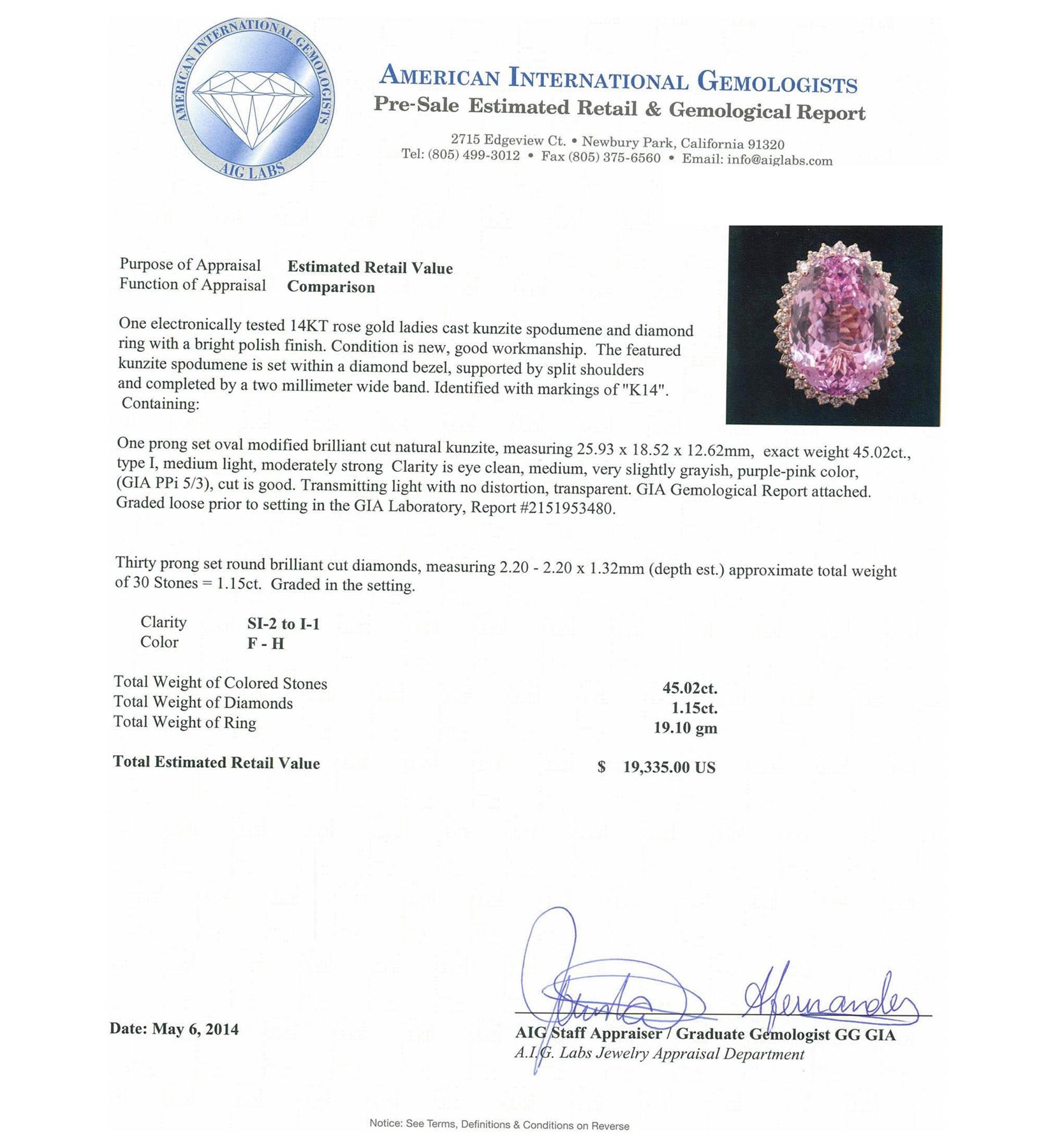 One electronically tested 14KT rose gold ladies cast kunzite spodumene and diamond ring with a bright polish finish. Condition is new, good workmanship. The featured kunzite spodumene is set within a diamond bezel, supported by split shoulders and completed by a two millimeter wide band. Identified with markings of "K14". Containing: One prong set oval modified brilliant cut natural kunzite, measuring 25.93 x 18.52 x 12.62mm, exact weight 45.02ct., type I, medium light, moderately strong Clarity is eye clean, medium, very slightly grayish, purple-pink color, (GIA PPi 5/3), cut is good. Transmitting light with no distortion, transparent. GIA Gemological Report attached. Graded loose prior to setting in the GIA Laboratory, Report #2151953480.Thirty prong set round brilliant cut diamonds, measuring 2.20 - 2.20 x 1.32mm (depth est.) approximate. Total Weight of 30 Stones = 1.15ct. Graded in the setting. Clarity: SI-2 to I-1. Color: F - H. Total Weight of Colored Stones 45.02ct. Total Weight of Diamonds 1.15ct. Total Weight of Ring 19.10 grams. AIG Appraised at $19,335.00.