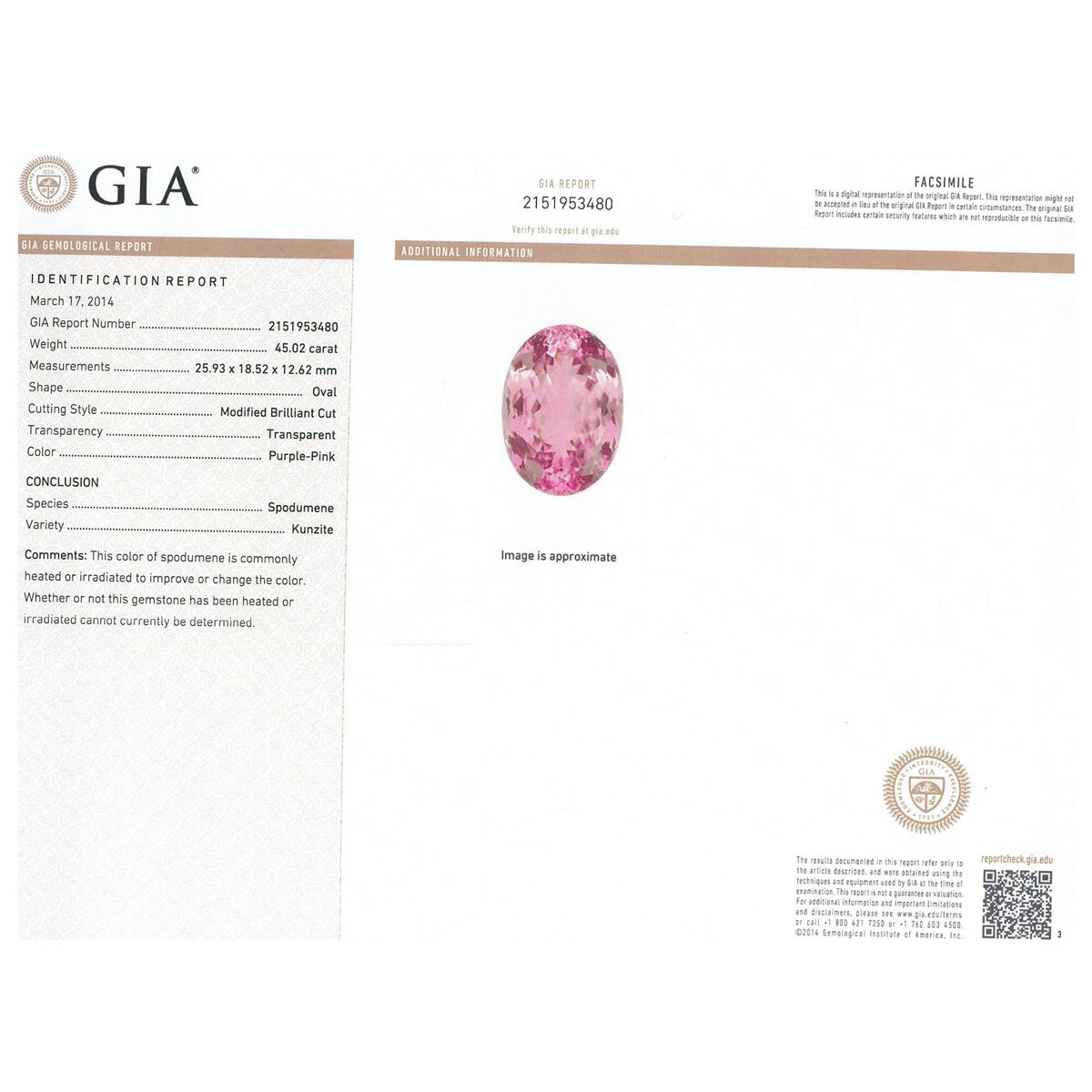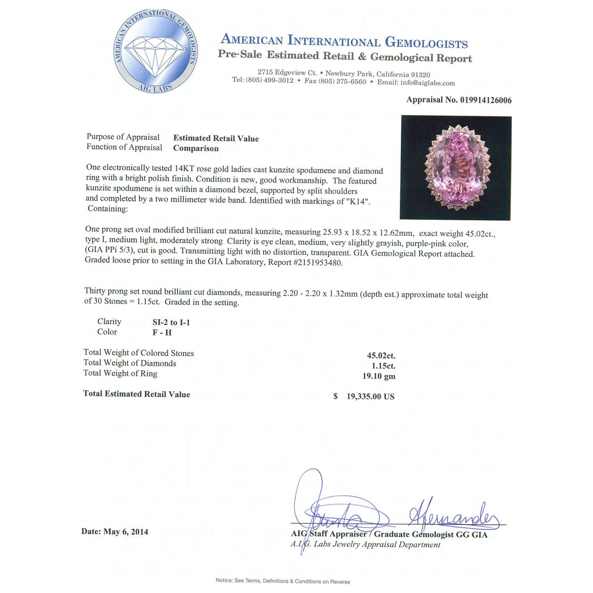 One electronically tested 14KT rose gold ladies cast kunzite spodumene and diamond ring with a bright polish finish. Condition is new, good workmanship. The featured kunzite spodumene is set within a diamond bezel, supported by split shoulders and completed by a two millimeter wide band. Identified with markings of "K14". Containing: One prong set oval modified brilliant cut natural kunzite, measuring 25.93 x 18.52 x 12.62mm, exact weight 45.02ct., type I, medium light, moderately strong Clarity is eye clean, medium, very slightly grayish, purple-pink color, (GIA PPi 5/3), cut is good. Transmitting light with no distortion, transparent. GIA Gemological Report attached. Graded loose prior to setting in the GIA Laboratory, Report #2151953480.Thirty prong set round brilliant cut diamonds, measuring 2.20 - 2.20 x 1.32mm (depth est.) approximate. Total Weight of 30 Stones = 1.15ct. Graded in the setting. Clarity: SI-2 to I-1. Color: F - H. Total Weight of Colored Stones 45.02ct. Total Weight of Diamonds 1.15ct. Total Weight of Ring 19.10 grams. AIG Appraised at $19,335.00.