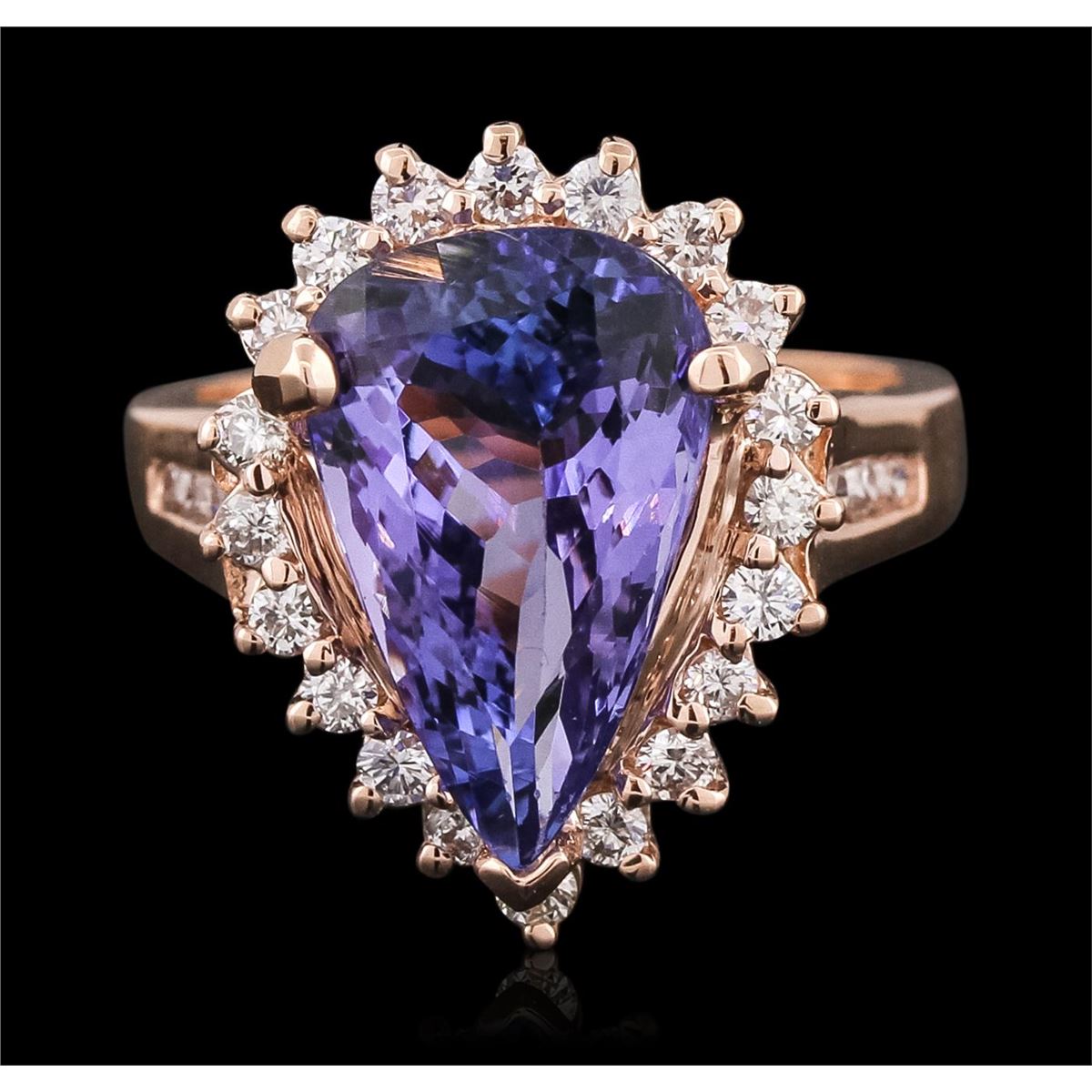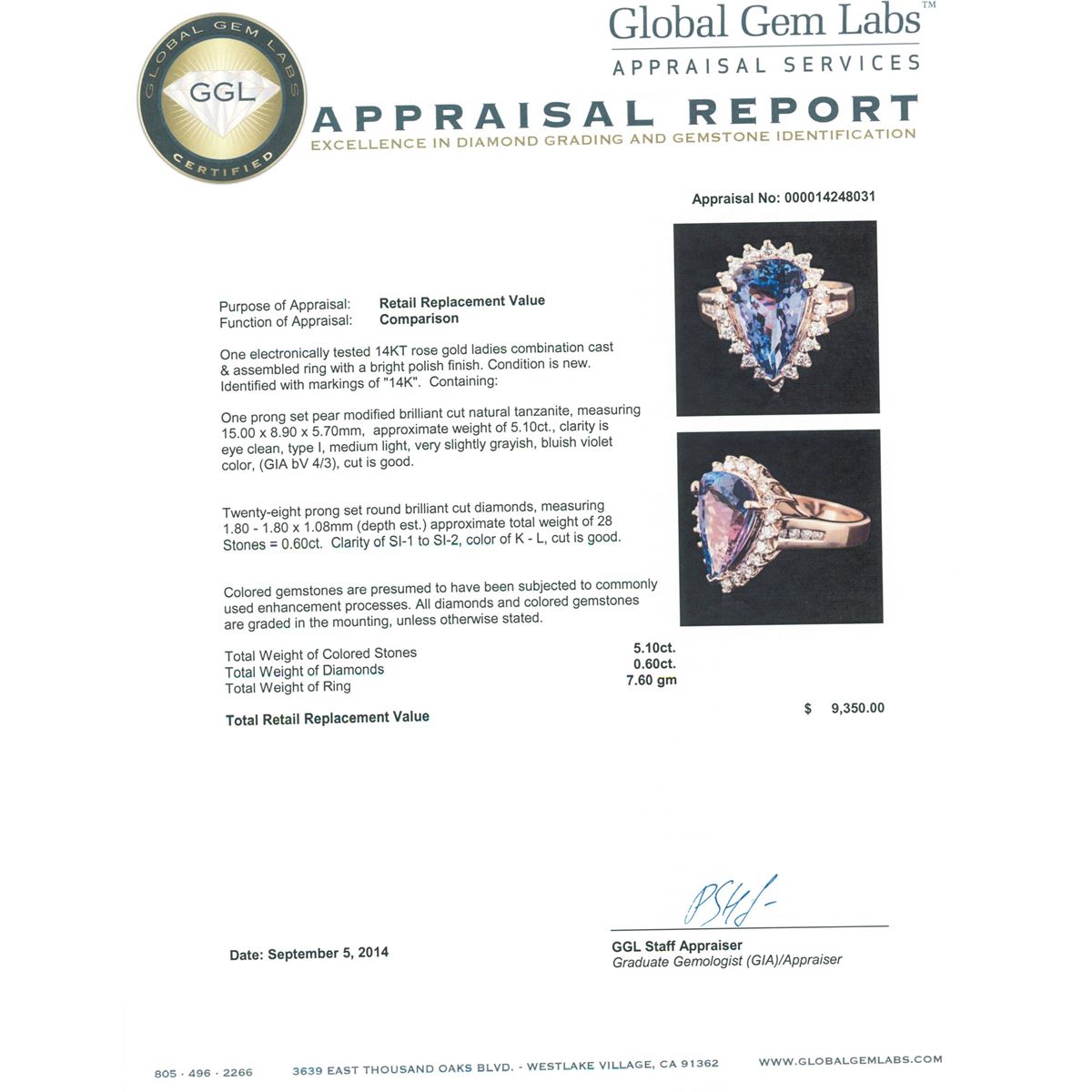 One electronically tested 14KT rose gold ladies combination cast & assembled ring with a bright polish finish. Identified with markings of "14K". Condition is new. Containing: One prong set pear modified brilliant cut natural tanzanite, measuring 15.00 x 8.90 x 5.70mm, approximate weight of 5.10ct., clarity is eye clean, type I, medium light, very slightly grayish, bluish violet color, (GIA bV 4/3), cut is good. Twenty-Eight prong set round brilliant cut diamonds, measuring 1.80 - 1.80 x 1.08mm (depth est.) approximate total weight of 28 Stones = 0.60ct. Clarity: SI-1 to SI-2. Color: K - L, Cut is Good. Colored gemstones are presumed to have been subjected to commonly used enhancement processes. All diamonds and colored gemstones are graded in the mounting, unless otherwise stated. Total Weight of Colored Stones 5.10ct. Total Weight of Diamonds 0.60ct. Total Weight of Ring 7.60 grams. GGL Appraised at $9,350.00.