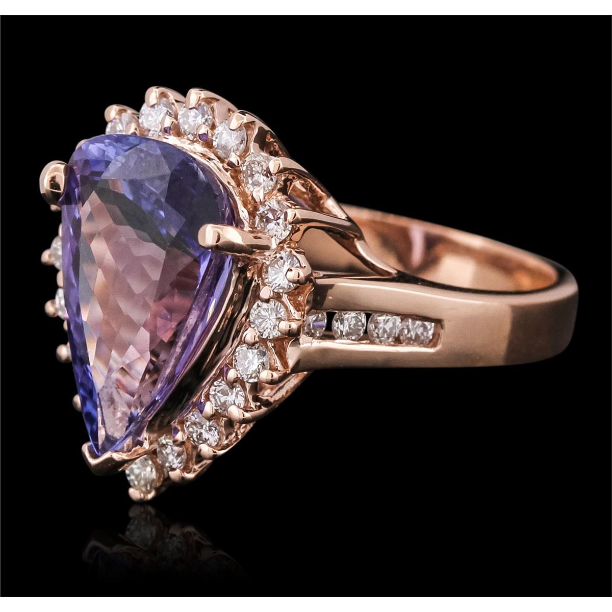 One electronically tested 14KT rose gold ladies combination cast & assembled ring with a bright polish finish. Identified with markings of "14K". Condition is new. Containing: One prong set pear modified brilliant cut natural tanzanite, measuring 15.00 x 8.90 x 5.70mm, approximate weight of 5.10ct., clarity is eye clean, type I, medium light, very slightly grayish, bluish violet color, (GIA bV 4/3), cut is good. Twenty-Eight prong set round brilliant cut diamonds, measuring 1.80 - 1.80 x 1.08mm (depth est.) approximate total weight of 28 Stones = 0.60ct. Clarity: SI-1 to SI-2. Color: K - L, Cut is Good. Colored gemstones are presumed to have been subjected to commonly used enhancement processes. All diamonds and colored gemstones are graded in the mounting, unless otherwise stated. Total Weight of Colored Stones 5.10ct. Total Weight of Diamonds 0.60ct. Total Weight of Ring 7.60 grams. GGL Appraised at $9,350.00.