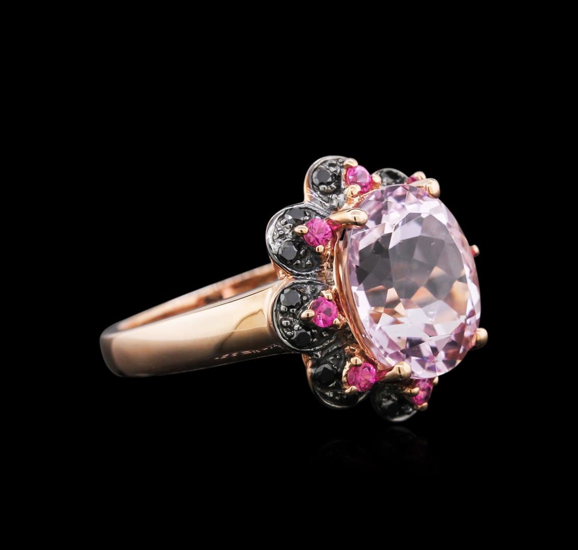 One ring featuring: 14KT rose gold weighing 3.73 grams containing one kunzite center stone with a total weight of 5.18ct, 16 black diamonds with a total weight of 0.20ct and eight pink sapphires with a total weight of 0.24ct.