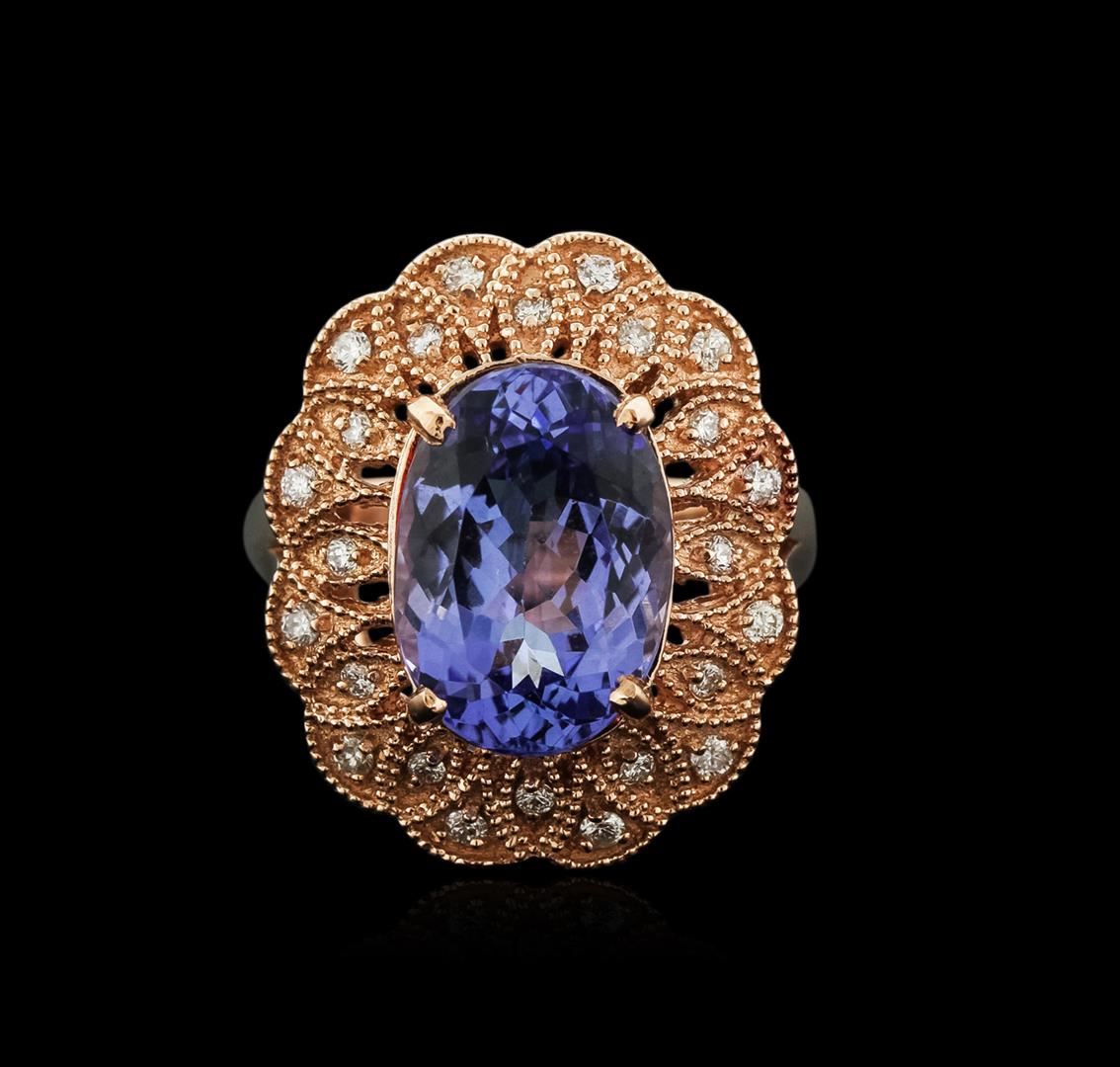 One electronically tested 14KT rose gold ladies cast tanzanite and diamond ring with a bright polish finish. Identified with markings of "K14". Condition is new. Containing: One prong set oval modified brilliant cut natural tanzanite, measuring 13.60 x 9.50 x 5.88mm, approximate weight of 5.34ct., clarity is eye clean, type I, medium light, very slightly grayish, violet color, (GIA V 4/3), cut is good. Twenty-Four prong set round brilliant cut diamonds, measuring 1.30 - 1.30 x 0.78mm (depth est.) approximate total weight of 24 Stones = 0.19ct. Clarity: SI-1 to SI-2. Color: H - I, Cut is Good. Colored gemstones are presumed to have been subjected to commonly used enhancement processes. All diamonds and colored gemstones are graded in the mounting, unless otherwise stated. Total Weight of Colored Stones 5.34ct. Total Weight of Diamonds 0.19ct. Total Weight of Ring 9.90 grams. GGL Appraised at $5,470.00.
