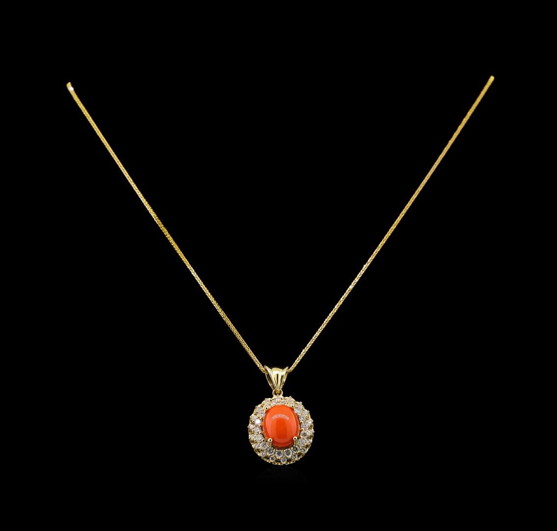 One electronically tested Gold-Rose-14KT ladies cast coral and diamond pendant & chain 16.0" long, with a lobster claw clasp with a bright polish finish. Identified with markings of "14K". Condition is new. Containing: One prong set oval cabochon cut natural red coral, measuring 12.00. x 10.00. x 6.50mm, approximate weight of 5.58ct., clarity is heavily included, very light, brownish, reddish orange color, (GIA rO 2/1), cut is good. Forty prong set round brilliant cut diamonds, measuring 2.30 - 1.30 x 1.08mm (depth est.) approximate total weight of 40 Stones = 0.85ct. Clarity: SI-1 to I-1. Color: I - J. Colored gemstones are presumed to have been subjected to commonly used enhancement processes. All diamonds and colored gemstones are graded in the mounting, unless otherwise stated. Total Weight of Colored Stones 5.58ct. Total Weight of Diamonds 0.85ct. Total Weight of Pendant & Chain 8.50 grams. GGL Appraised at $3,445.00.