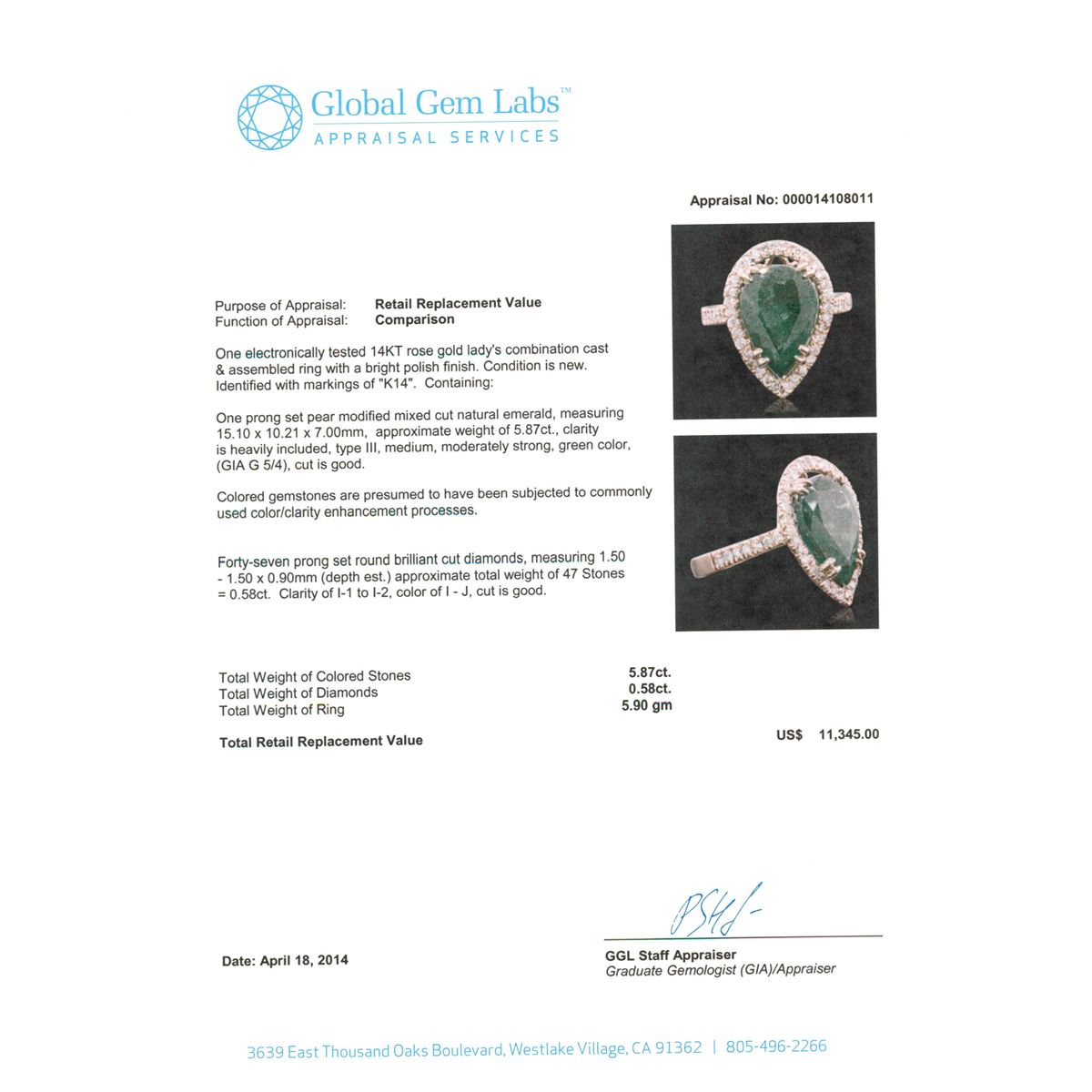 One electronically tested 14KT rose gold Ladies combination cast & assembled ring with a bright polish finish. Identified with markings of "K14". Condition is new. Containing: One prong set pear modified mixed cut natural emerald, measuring 15.10 x 10.21 x 7.00mm, approximate weight of 5.87ct., clarity is heavily included, type III, medium, moderately strong, green color, (GIA G 5/4), cut is good. Colored gemstones are presumed to have been subjected to commonly used color/clarity enhancement processes. Forty-Seven prong set round brilliant cut diamonds, measuring 1.50 - 1.50 x 0.90mm (depth est.) approximate. Total Weight of 47 Stones = 0.58ct. Clarity: I-1 to I-2. Color: I - J, Cut is Good. Total Weight of Colored Stones 5.87ct. Total Weight of Diamonds 0.58ct. Total Weight of Ring 5.90 grams. GGL Appraised at $11,345.00.