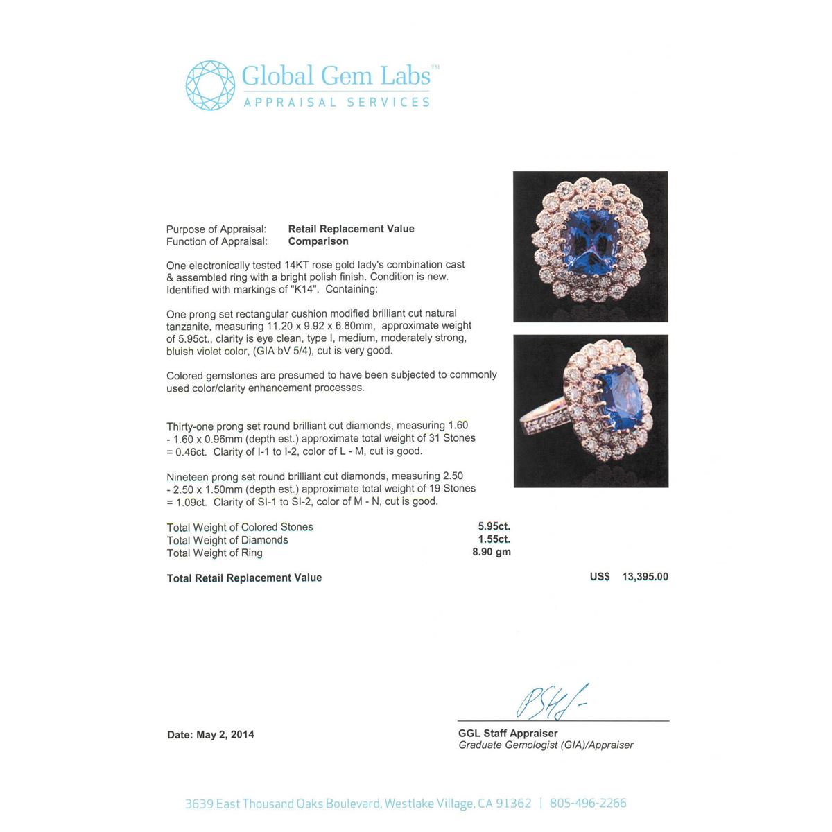 One electronically tested 14KT rose gold Ladies combination cast & assembled ring with a bright polish finish. Condition is new. Identified with markings of "K14". Containing: One prong set rectangular cushion modified brilliant cut natural tanzanite, measuring 11.20 x 9.92 x 6.80mm, approximate weight of 5.95ct., clarity is eye clean, type I, medium, moderately strong, bluish violet color, (GIA bV 5/4), cut is very good. Colored gemstones are presumed to have been subjected to commonly used color/clarity enhancement processes. Thirty-One prong set round brilliant cut diamonds, measuring 1.60 - 1.60 x 0.96mm (depth est.) approximate. Total Weight of 31 Stones = 0.46ct. Clarity: I-1 to I-2. Color: L - M, Cut is Good. Nineteen prong set round brilliant cut diamonds, measuring 2.50 - 2.50 x 1.50mm (depth est.) approximate. Total Weight of 19 Stones = 1.09ct. Clarity: SI-1 to SI-2. Color: M - N, Cut is Good. Total Weight of Colored Stones 5.95ct. Total Weight of Diamonds 1.55ct. Total Weight of Ring 8.90 grams. GGL Appraised at $13,395.00.