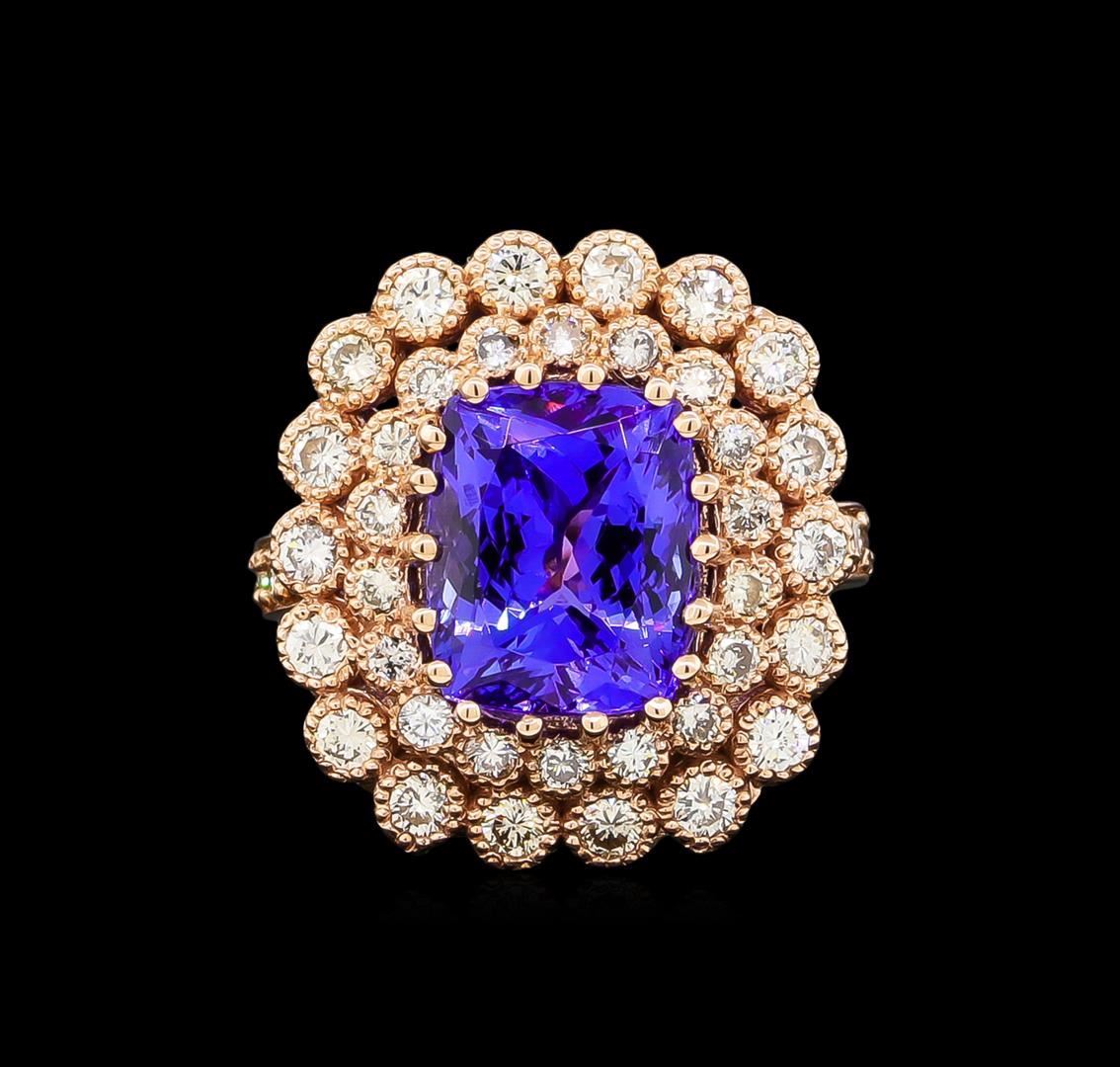 One electronically tested 14KT rose gold Ladies combination cast & assembled ring with a bright polish finish. Condition is new. Identified with markings of "K14". Containing: One prong set rectangular cushion modified brilliant cut natural tanzanite, measuring 11.20 x 9.92 x 6.80mm, approximate weight of 5.95ct., clarity is eye clean, type I, medium, moderately strong, bluish violet color, (GIA bV 5/4), cut is very good. Colored gemstones are presumed to have been subjected to commonly used color/clarity enhancement processes. Thirty-One prong set round brilliant cut diamonds, measuring 1.60 - 1.60 x 0.96mm (depth est.) approximate. Total Weight of 31 Stones = 0.46ct. Clarity: I-1 to I-2. Color: L - M, Cut is Good. Nineteen prong set round brilliant cut diamonds, measuring 2.50 - 2.50 x 1.50mm (depth est.) approximate. Total Weight of 19 Stones = 1.09ct. Clarity: SI-1 to SI-2. Color: M - N, Cut is Good. Total Weight of Colored Stones 5.95ct. Total Weight of Diamonds 1.55ct. Total Weight of Ring 8.90 grams. GGL Appraised at $13,395.00.