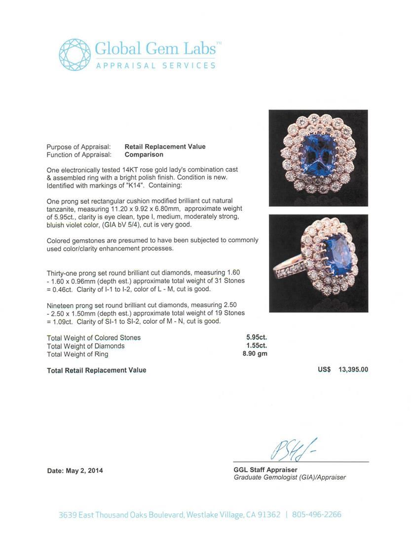 One electronically tested 14KT rose gold Ladies combination cast & assembled ring with a bright polish finish. Condition is new. Identified with markings of "K14". Containing: One prong set rectangular cushion modified brilliant cut natural tanzanite, measuring 11.20 x 9.92 x 6.80mm, approximate weight of 5.95ct., clarity is eye clean, type I, medium, moderately strong, bluish violet color, (GIA bV 5/4), cut is very good. Colored gemstones are presumed to have been subjected to commonly used color/clarity enhancement processes. Thirty-One prong set round brilliant cut diamonds, measuring 1.60 - 1.60 x 0.96mm (depth est.) approximate. Total Weight of 31 Stones = 0.46ct. Clarity: I-1 to I-2. Color: L - M, Cut is Good. Nineteen prong set round brilliant cut diamonds, measuring 2.50 - 2.50 x 1.50mm (depth est.) approximate. Total Weight of 19 Stones = 1.09ct. Clarity: SI-1 to SI-2. Color: M - N, Cut is Good. Total Weight of Colored Stones 5.95ct. Total Weight of Diamonds 1.55ct. Total Weight of Ring 8.90 grams. GGL Appraised.