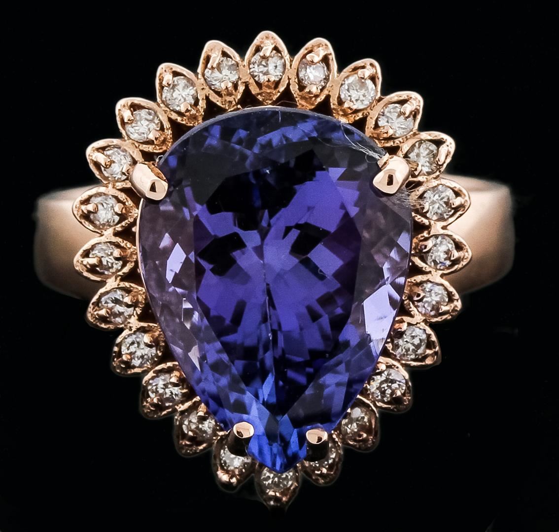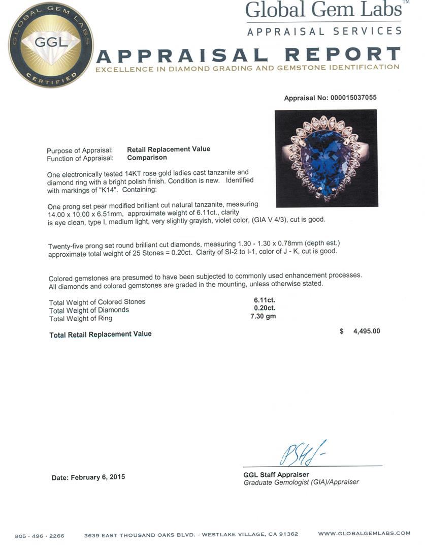 One electronically tested 14KT rose gold ladies cast tanzanite and diamond ring with a bright polish finish. Identified with markings of "K14". Condition is new. Containing: One prong set pear modified brilliant cut natural tanzanite, measuring 14.00 x 10.00 x 6.51mm, approximate weight of 6.11ct., clarity is eye clean, type I, medium light, very slightly grayish, violet color, (GIA V 4/3), cut is good. Twenty-Five prong set round brilliant cut diamonds, measuring 1.30 - 1.30 x 0.78mm (depth est.) approximate. total weight of 25 Stones = 0.20ct. Clarity: SI-2 to I-1. Color: J - K, Cut is Good. Colored gemstones are presumed to have been subjected to commonly used enhancement processes. All diamonds and colored gemstones are graded in the mounting, unless otherwise stated. Total Weight of Colored Stones 6.11ct. Total Weight of Diamonds 0.20ct. Total Weight of Ring 7.30 grams. GGL Appraised at $4,495.00.