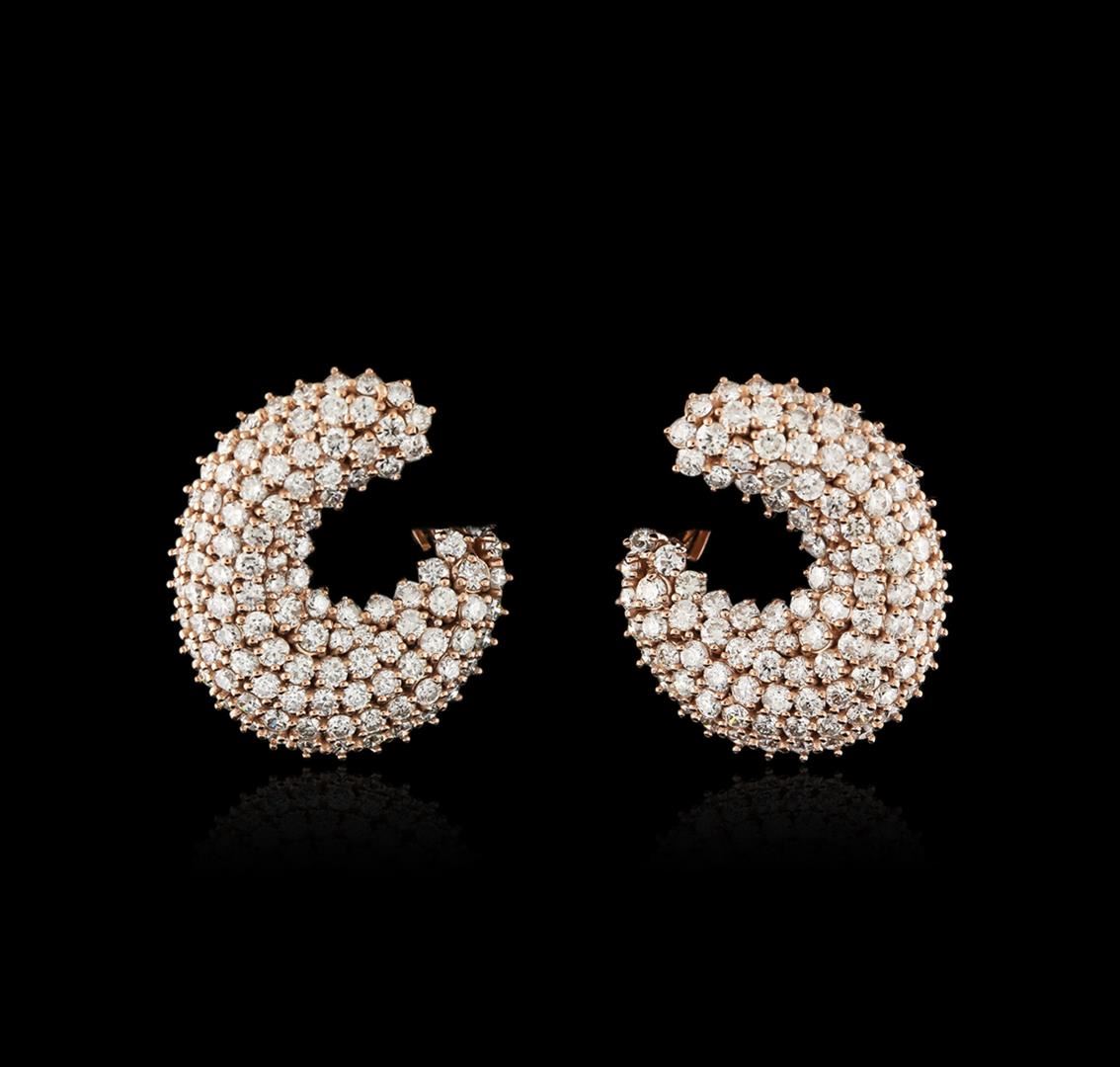 One pair electronically tested 14KT rose gold ladies cast diamond earrings with Omega clip backs with a bright polish finish. Identified with markings of "585". Condition is new. Containing: Two hundred twenty prong set round brilliant cut diamonds, measuring 2.20 - 1.80 x 1.20mm (depth est.) approximate total weight of 220 Stones = 6.30ct. Clarity: SI-1 to I-1. Color: H-I, Cut is Good. Diamonds are graded in the mounting, unless otherwise stated. Total Weight of Diamonds 6.30ct. Total Weight of Earrings 12.60 grams. GGL Appraised at $8,860.00.