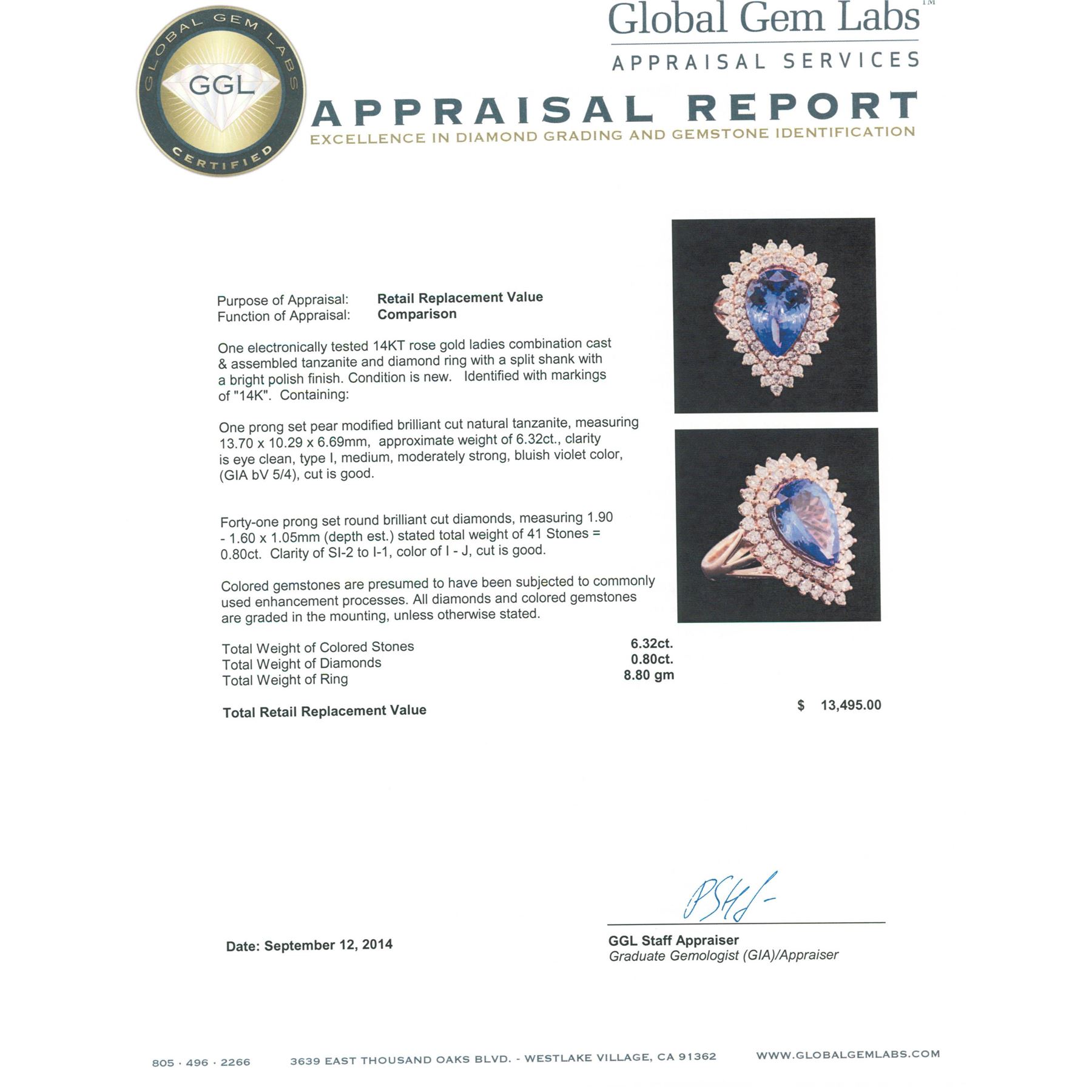 One electronically tested 14KT rose gold ladies combination cast & assembled tanzanite and diamond ring with a split shank with a bright polish finish. Identified with markings of "14K". Condition is new. Containing: One prong set pear modified brilliant cut natural tanzanite, measuring 13.70 x 10.29 x 6.69mm, approximate weight of 6.32ct., clarity is eye clean, type I, medium, moderately strong, bluish violet color, (GIA bV 5/4), cut is good. Forty-One prong set round brilliant cut diamonds, measuring 1.90 - 1.60 x 1.05mm (depth est.) stated total weight of 41 Stones = 0.80ct. Clarity: SI-2 to I-1. Color: I - J, Cut is Good. Colored gemstones are presumed to have been subjected to commonly used enhancement processes. All diamonds and colored gemstones are graded in the mounting, unless otherwise stated total weight of Colored Stones 6.32ct. Total Weight of Diamonds 0.80ct. Total Weight of Ring 8.80 grams. GGL Appraised at $13,495.00.