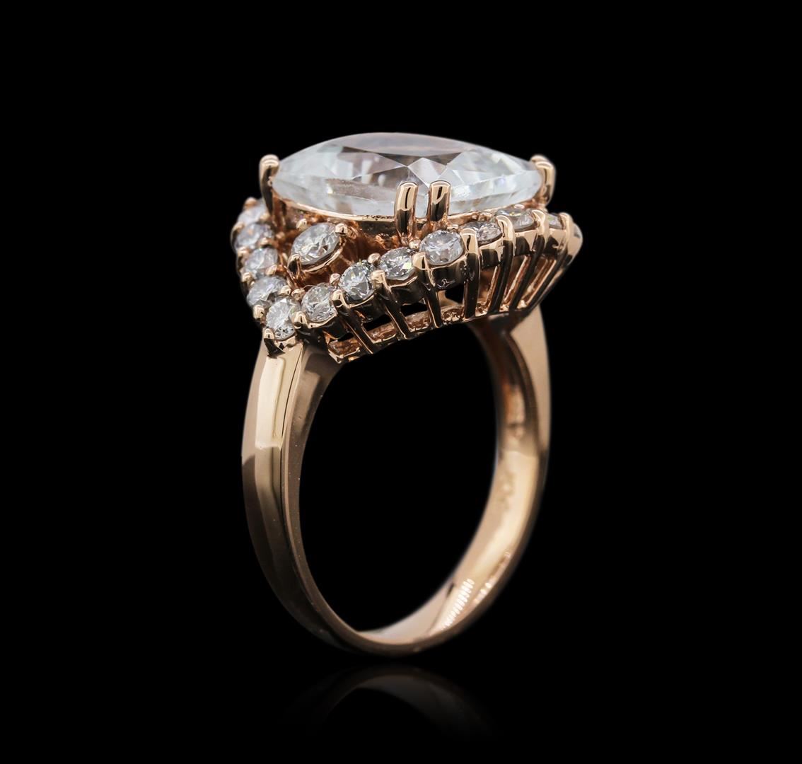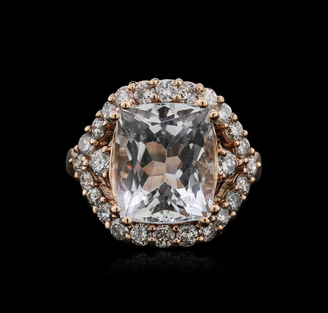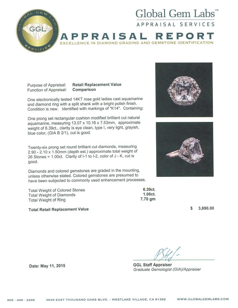 One electronically tested 14KT rose gold ladies cast aquamarine and diamond ring with a split shank with a bright polish finish. Identified with markings of "K14". Condition is new. Containing: One prong set rectangular cushion modified brilliant cut natural aquamarine, measuring 13.07 x 10.16 x 7.53mm, approximate weight of 6.39ct., clarity is eye clean, type I, very light, grayish, blue color, (GIA B 2/1), cut is good. Twenty-Six prong set round brilliant cut diamonds, measuring 2.90 - 2.10 x 1.50mm (depth est.) approximate total weight of 26 Stones = 1.00ct. Clarity: I-1 to I-2. Color: J - K, Cut is Good. Diamonds and colored gemstones are graded in the mounting, unless otherwise stated. Colored gemstones are presumed to have been subjected to commonly used enhancement processes. Total Weight of Colored Stones 6.39ct. Total Weight of Diamonds 1.00ct. Total Weight of Ring 7.70 grams. GGL Appraised at $3,890.00.