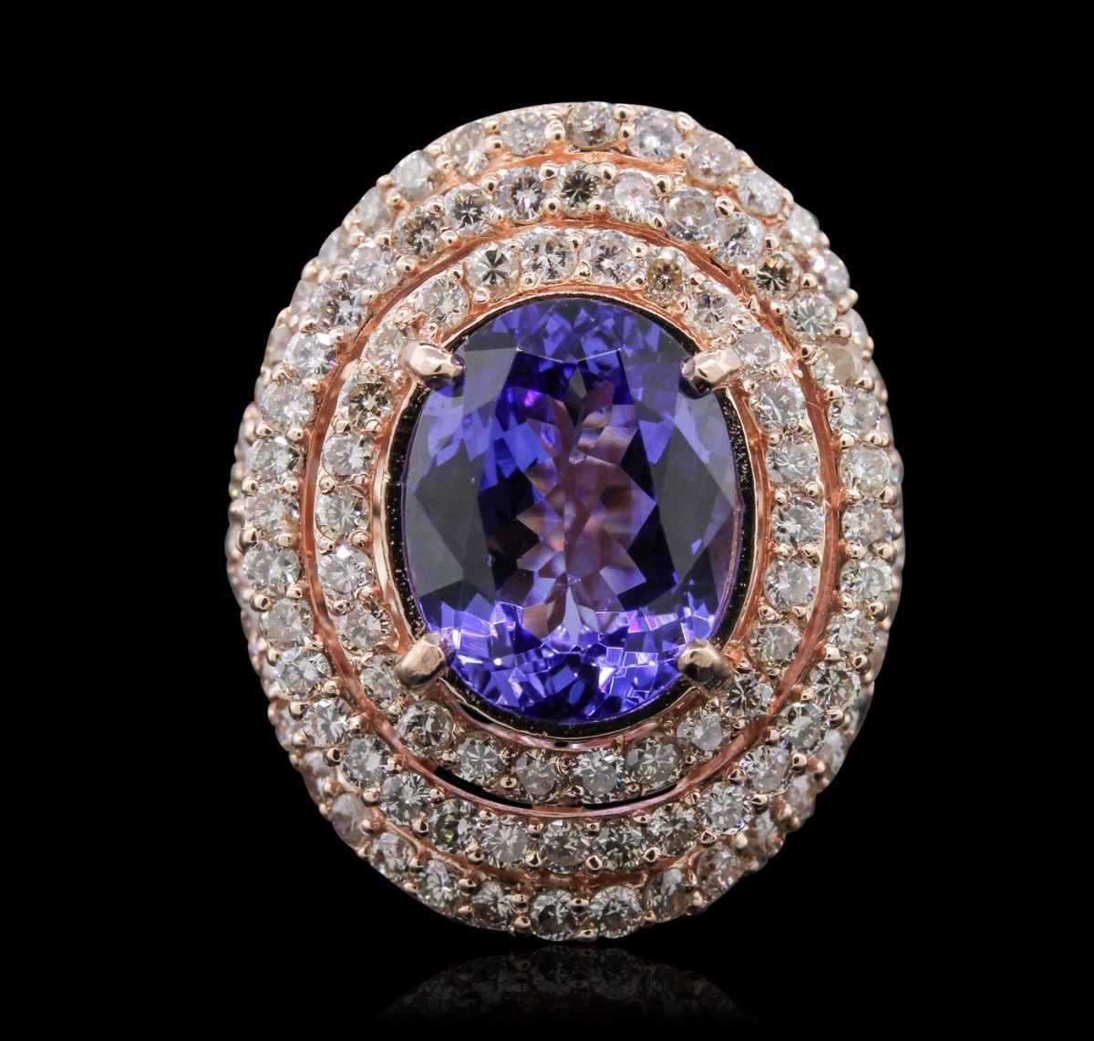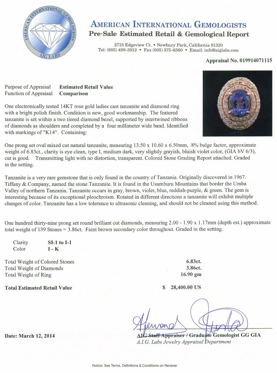 One electronically tested 14KT rose gold ladies cast tanzanite and diamond ring with a bright polish finish. Condition is new, good workmanship. The featured tanzanite is set within a two tiered diamond bezel, supported by intertwined ribbons of diamonds as shoulders and completed by a four millimeter wide band. Identified with markings of "K14". Containing: One prong set oval mixed cut natural tanzanite, measuring 13.50 x 10.60 x 6.50mm, 8%. bulge factor, approximate weight of 6.83ct., clarity is eye clean, type I, medium dark, very slightly grayish, bluish violet color, (GIA bV 6/3), cut is good. Transmitting light with no distortion, transparent. Colored Stone Grading Report attached. Graded in the setting. Tanzanite is a very rare gemstone that is only found in the country of Tanzania. Originally discovered in 1967. Tiffany & Company, named the stone Tanzanite. It is found in the Usumburu Mountains that border the Umba Valley of northern Tanzania. Tanzanite occurs in gray, brown, violet, blue, reddish-purple, & green. The gem is interesting because of its exceptional pleochroism. Rotated in different directions a tanzanite will exhibit multiple changes of color. Tanzanite has a low tolerance to ultrasonic cleaning, and should not be cleaned using this method. One Hundred Thirty-Nine prong set round brilliant cut diamonds, measuring 2.00 - 1.90 x 1.17mm (depth est.) approximate. Total Weight of 139 Stones = 3.86ct. Faint brown secondary color throughout. Graded in the setting. Clarity: SI-1 to I-1. Color: I - K. Total Weight of Colored Stones 6.83ct. Total Weight of Diamonds 3.86ct. Total Weight of Ring 16.90 grams. AIG Appraised at $28,400.00.