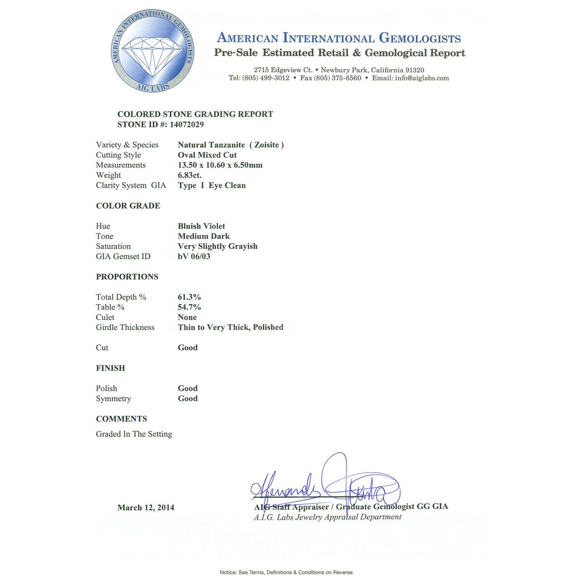One electronically tested 14KT rose gold ladies cast tanzanite and diamond ring with a bright polish finish. Condition is new, good workmanship. The featured tanzanite is set within a two tiered diamond bezel, supported by intertwined ribbons of diamonds as shoulders and completed by a four millimeter wide band. Identified with markings of "K14". Containing: One prong set oval mixed cut natural tanzanite, measuring 13.50 x 10.60 x 6.50mm, 8%. bulge factor, approximate weight of 6.83ct., clarity is eye clean, type I, medium dark, very slightly grayish, bluish violet color, (GIA bV 6/3), cut is good. Transmitting light with no distortion, transparent. Colored Stone Grading Report attached. Graded in the setting. Tanzanite is a very rare gemstone that is only found in the country of Tanzania. Originally discovered in 1967. Tiffany & Company, named the stone Tanzanite. It is found in the Usumburu Mountains that border the Umba Valley of northern Tanzania. Tanzanite occurs in gray, brown, violet, blue, reddish-purple, & green. The gem is interesting because of its exceptional pleochroism. Rotated in different directions a tanzanite will exhibit multiple changes of color. Tanzanite has a low tolerance to ultrasonic cleaning, and should not be cleaned using this method. One Hundred Thirty-Nine prong set round brilliant cut diamonds, measuring 2.00 - 1.90 x 1.17mm (depth est.) approximate. Total Weight of 139 Stones = 3.86ct. Faint brown secondary color throughout. Graded in the setting. Clarity: SI-1 to I-1. Color: I - K. Total Weight of Colored Stones 6.83ct. Total Weight of Diamonds 3.86ct. Total Weight of Ring 16.90 grams. AIG Appraised at $28,400.00.