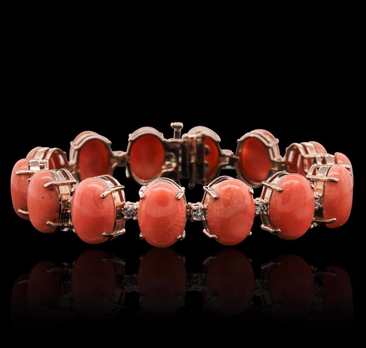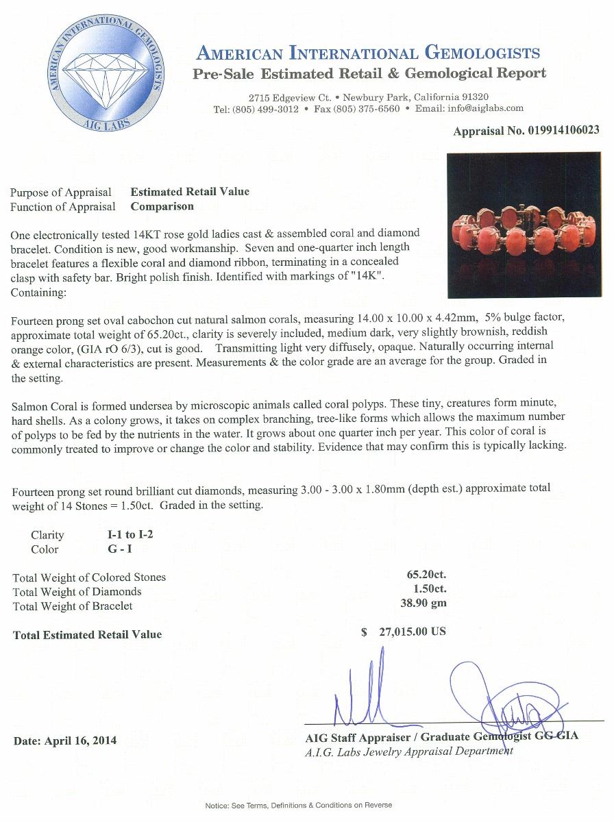 One electronically tested 14KT rose gold ladies cast & assembled coral and diamond bracelet. Condition is new, good workmanship. Seven and one-quarter inch length bracelet features a flexible coral and diamond ribbon, terminating in a concealed clasp with safety bar. Bright polish finish. Identified with markings of "14K". Containing: Fourteen prong set oval cabochon cut natural salmon corals, measuring 14.00 x 10.00 x 4.42mm, 5%. bulge factor, approximate. Total Weight of 65.20ct., clarity is severely included, medium dark, very slightly brownish, reddish orange color, (GIA rO 6/3), cut is good. Transmitting light very diffusely, opaque. Naturally occurring internal & external characteristics are present. Measurements & the color grade are an average for the group. Graded in the setting. Salmon Coral is formed undersea by microscopic animals called coral polyps. These tiny, creatures form minute, hard shells. As a colony grows, it takes on complex branching, tree-like forms which allows the maximum number of polyps to be fed by the nutrients in the water. It grows about one quarter inch per year. This color of coral is commonly treated to improve or change the color and stability. Evidence that may confirm this is typically lacking. Fourteen prong set round brilliant cut diamonds, measuring 3.00 - 3.00 x 1.80mm (depth est.) approximate. Total Weight of 14 Stones = 1.50ct. Graded in the setting. Clarity: I-1 to I-2. Color: G - I. Total Weight of Colored Stones 65.20ct. Total Weight of Diamonds 1.50ct. Total Weight of Bracelet 38.90 grams. AIG Appraised at $27,015.00.