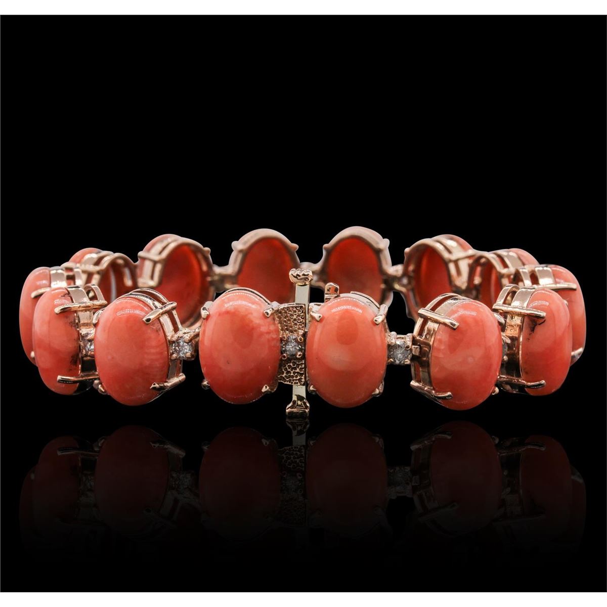 One electronically tested 14KT rose gold ladies cast & assembled coral and diamond bracelet. Condition is new, good workmanship. Seven and one-quarter inch length bracelet features a flexible coral and diamond ribbon, terminating in a concealed clasp with safety bar. Bright polish finish. Identified with markings of "14K". Containing: Fourteen prong set oval cabochon cut natural salmon corals, measuring 14.00 x 10.00 x 4.42mm, 5%. bulge factor, approximate. Total Weight of 65.20ct., clarity is severely included, medium dark, very slightly brownish, reddish orange color, (GIA rO 6/3), cut is good. Transmitting light very diffusely, opaque. Naturally occurring internal & external characteristics are present. Measurements & the color grade are an average for the group. Graded in the setting. Salmon Coral is formed undersea by microscopic animals called coral polyps. These tiny, creatures form minute, hard shells. As a colony grows, it takes on complex branching, tree-like forms which allows the maximum number of polyps to be fed by the nutrients in the water. It grows about one quarter inch per year. This color of coral is commonly treated to improve or change the color and stability. Evidence that may confirm this is typically lacking. Fourteen prong set round brilliant cut diamonds, measuring 3.00 - 3.00 x 1.80mm (depth est.) approximate. Total Weight of 14 Stones = 1.50ct. Graded in the setting. Clarity: I-1 to I-2. Color: G - I. Total Weight of Colored Stones 65.20ct. Total Weight of Diamonds 1.50ct. Total Weight of Bracelet 38.90 grams. AIG Appraised at $27,015.00.