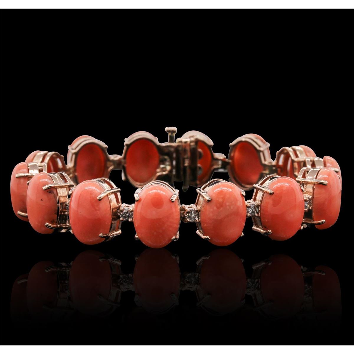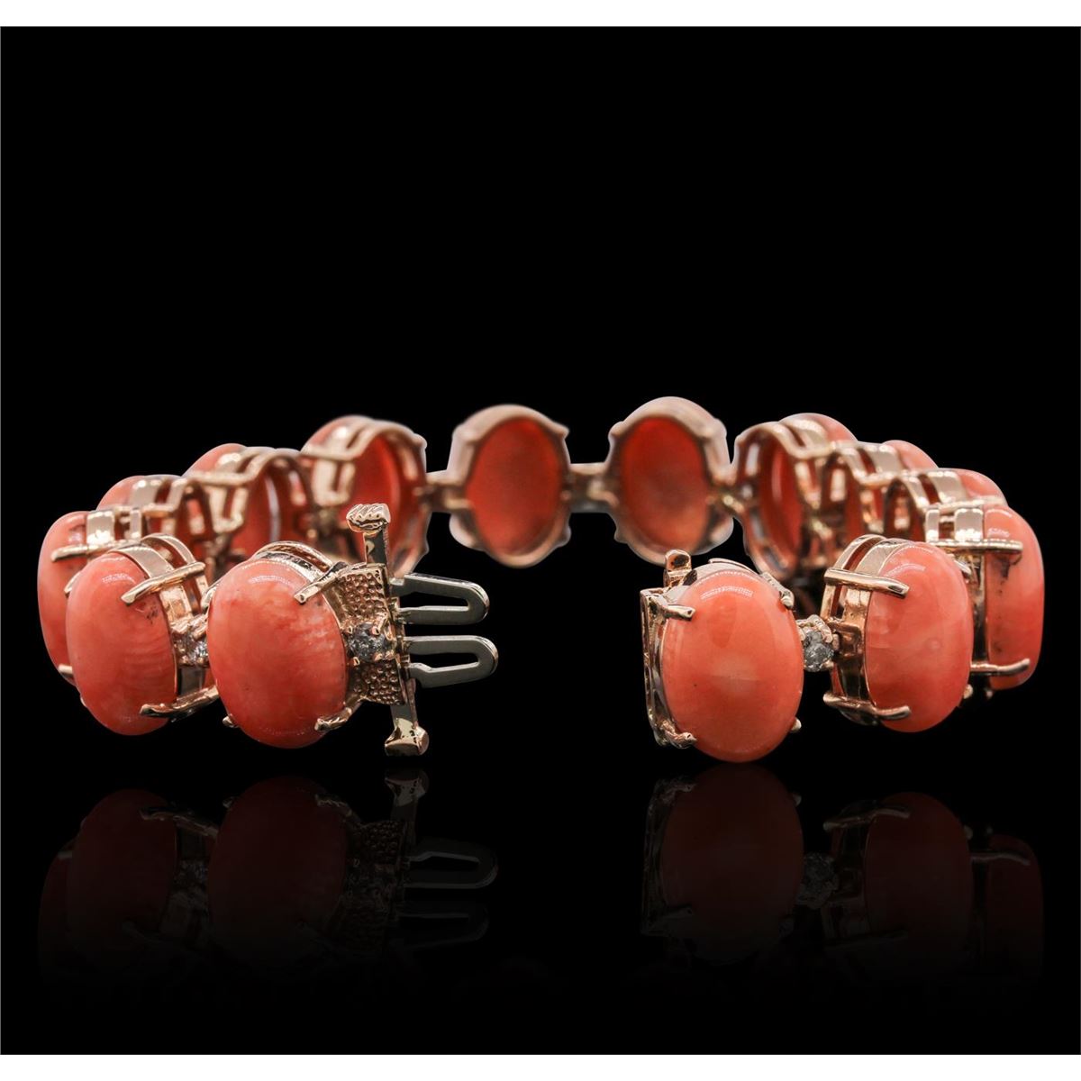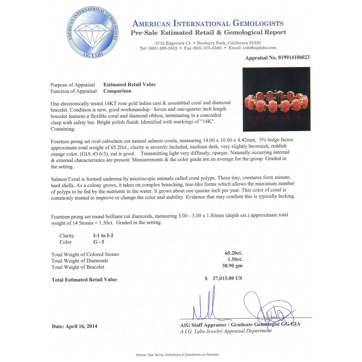 One electronically tested 14KT rose gold ladies cast & assembled coral and diamond bracelet. Condition is new, good workmanship. Seven and one-quarter inch length bracelet features a flexible coral and diamond ribbon, terminating in a concealed clasp with safety bar. Bright polish finish. Identified with markings of "14K". Containing: Fourteen prong set oval cabochon cut natural salmon corals, measuring 14.00 x 10.00 x 4.42mm, 5%. bulge factor, approximate. Total Weight of 65.20ct., clarity is severely included, medium dark, very slightly brownish, reddish orange color, (GIA rO 6/3), cut is good. Transmitting light very diffusely, opaque. Naturally occurring internal & external characteristics are present. Measurements & the color grade are an average for the group. Graded in the setting. Salmon Coral is formed undersea by microscopic animals called coral polyps. These tiny, creatures form minute, hard shells. As a colony grows, it takes on complex branching, tree-like forms which allows the maximum number of polyps to be fed by the nutrients in the water. It grows about one quarter inch per year. This color of coral is commonly treated to improve or change the color and stability. Evidence that may confirm this is typically lacking. Fourteen prong set round brilliant cut diamonds, measuring 3.00 - 3.00 x 1.80mm (depth est.) approximate. Total Weight of 14 Stones = 1.50ct. Graded in the setting. Clarity: I-1 to I-2. Color: G - I. Total Weight of Colored Stones 65.20ct. Total Weight of Diamonds 1.50ct. Total Weight of Bracelet 38.90 grams. AIG Appraised at $27,015.00.