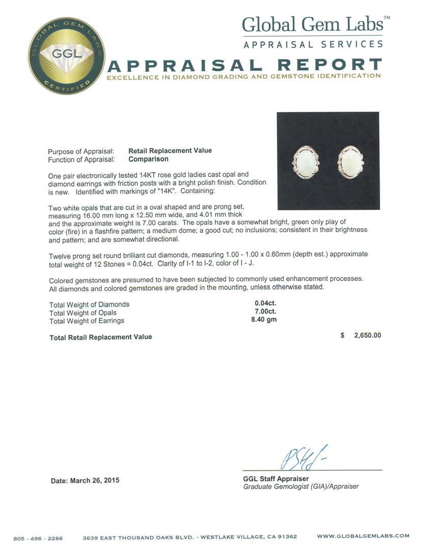 One pair electronically tested 14KT rose gold ladies cast opal and diamond earrings with friction posts with a bright polish finish. Identified with markings of "14K". Condition is new. Containing: Two white opals that are cut in a oval shaped and are prong set, measuring 16.00 mm long x 12.50 mm wide, and 4.01 mm thick and the approximate weight is 7.00 carats. The opals have a somewhat bright, green only play of color (fire) in a flashfire pattern; a medium dome; a good cut; no inclusions; consistent in their brightness and pattern; and are somewhat directional. Twelve prong set round brilliant cut diamonds, measuring 1.00 - 1.00 x 0.60mm (depth est.) approximate total weight of 12 Stones = 0.04ct. Clarity: I-1 to I-2. Color: I - J. Colored gemstones are presumed to have been subjected to commonly used enhancement processes. All diamonds and colored gemstones are graded in the mounting, unless otherwise stated. Total Weight of Diamonds 0.04ct. Total Weight of Opals 7.00ct. Total Weight of Earrings 8.40 grams. GGL Appraised at $2,650.00.
