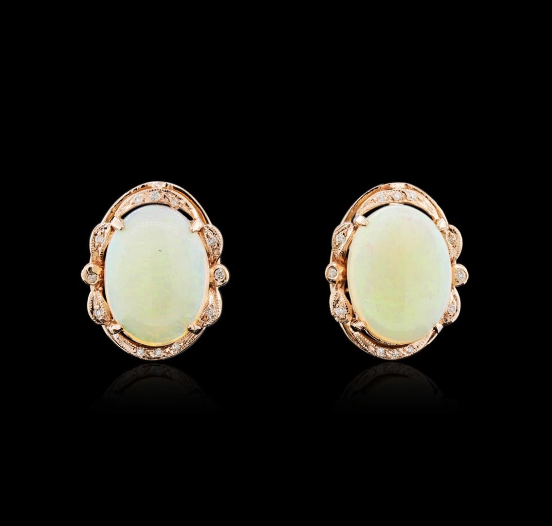 One pair electronically tested 14KT rose gold ladies cast opal and diamond earrings with friction posts with a bright polish finish. Identified with markings of "14K". Condition is new. Containing: Two white opals that are cut in a oval shaped and are prong set, measuring 16.00 mm long x 12.50 mm wide, and 4.01 mm thick and the approximate weight is 7.00 carats. The opals have a somewhat bright, green only play of color (fire) in a flashfire pattern; a medium dome; a good cut; no inclusions; consistent in their brightness and pattern; and are somewhat directional. Twelve prong set round brilliant cut diamonds, measuring 1.00 - 1.00 x 0.60mm (depth est.) approximate total weight of 12 Stones = 0.04ct. Clarity: I-1 to I-2. Color: I - J. Colored gemstones are presumed to have been subjected to commonly used enhancement processes. All diamonds and colored gemstones are graded in the mounting, unless otherwise stated. Total Weight of Diamonds 0.04ct. Total Weight of Opals 7.00ct. Total Weight of Earrings 8.40 grams. GGL Appraised at $2,650.00.