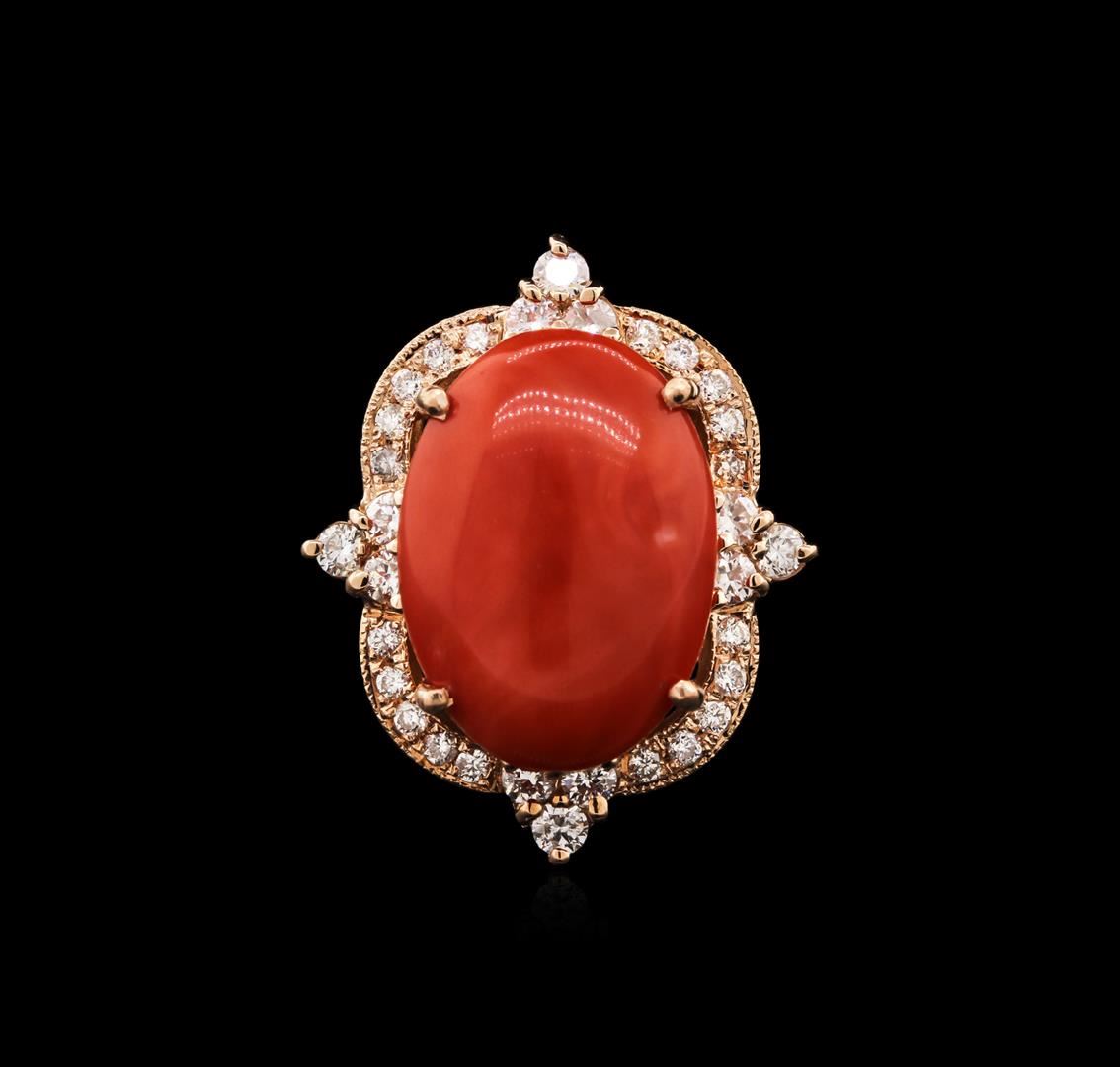 One electronically tested 14KT rose gold ladies cast coral and diamond ring with a bright polish finish. Identified with markings of "14K". Condition is new. Containing: One prong set oval cabochon cut natural pink coral, measuring 19.00 x 14.00 x 5.84mm, approximate weight of 7.57ct., clarity is severely included, medium dark, moderately strong, pink color, (GIA Pk 6/4), cut is good. Thirty-Two prong set round brilliant cut diamonds, measuring 2.20 - 1.30 x 1.05mm (depth est.) approximate total weight of 32 Stones = 0.82ct. Clarity: SI-2 to I-1. Color: I - J, Cut is Good. Colored gemstones are presumed to have been subjected to commonly used enhancement processes. All diamonds and colored gemstones are graded in the mounting, unless otherwise stated. Total Weight of Colored Stones 7.57ct. Total Weight of Diamonds 0.82ct. Total Weight of Ring 10.10 grams. GGL Appraised at $4,105.00.