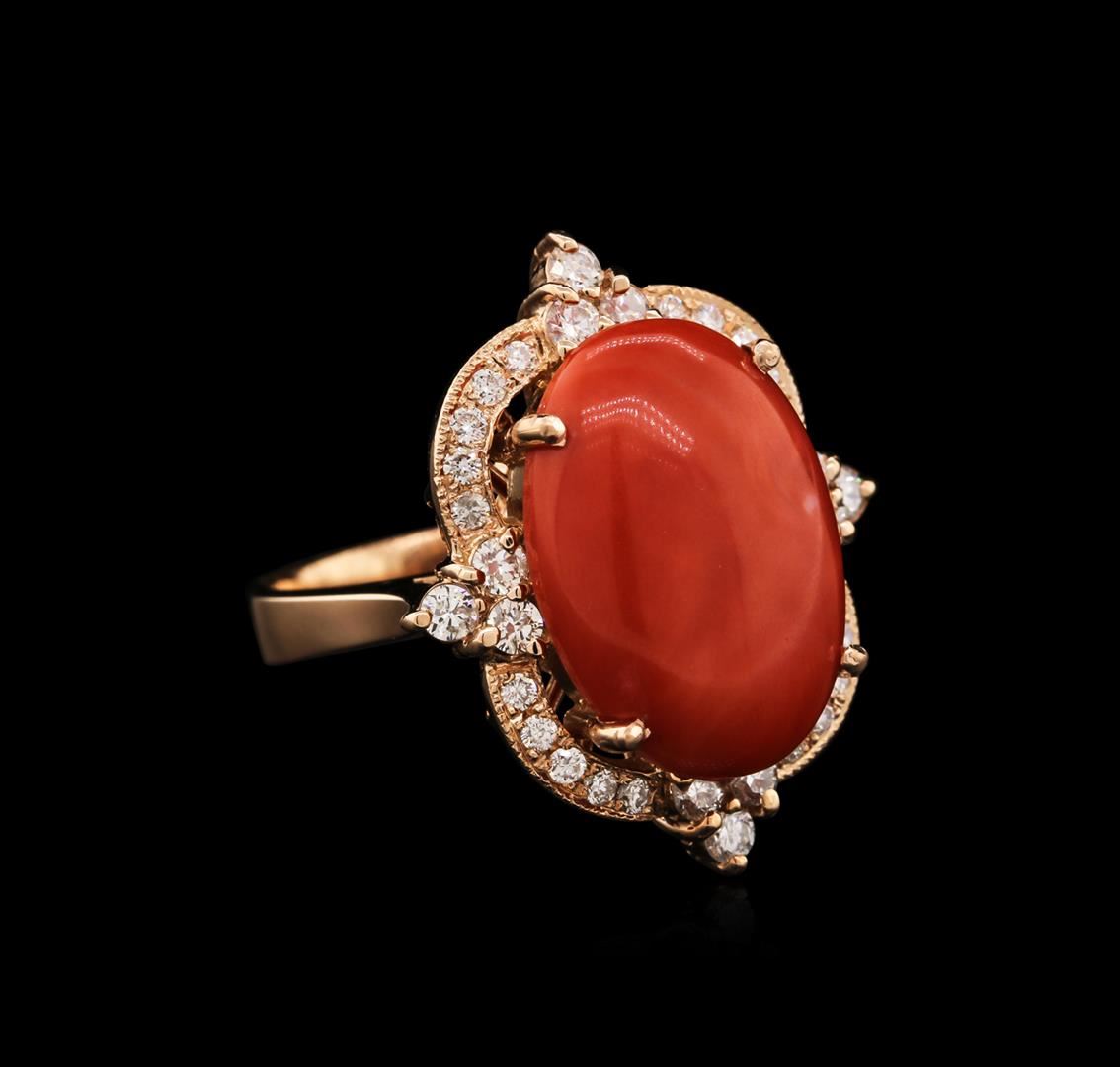 One electronically tested 14KT rose gold ladies cast coral and diamond ring with a bright polish finish. Identified with markings of "14K". Condition is new. Containing: One prong set oval cabochon cut natural pink coral, measuring 19.00 x 14.00 x 5.84mm, approximate weight of 7.57ct., clarity is severely included, medium dark, moderately strong, pink color, (GIA Pk 6/4), cut is good. Thirty-Two prong set round brilliant cut diamonds, measuring 2.20 - 1.30 x 1.05mm (depth est.) approximate total weight of 32 Stones = 0.82ct. Clarity: SI-2 to I-1. Color: I - J, Cut is Good. Colored gemstones are presumed to have been subjected to commonly used enhancement processes. All diamonds and colored gemstones are graded in the mounting, unless otherwise stated. Total Weight of Colored Stones 7.57ct. Total Weight of Diamonds 0.82ct. Total Weight of Ring 10.10 grams. GGL Appraised at $4,105.00.