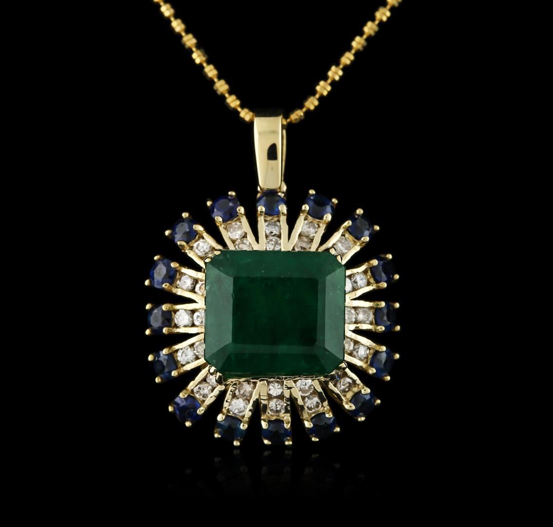 One electronically tested 14KT rose gold ladies combination cast & assembled emerald, sapphire and diamond pendant & chain 18.0" long, thin with a lobster claw clasp with a bright polish finish. Identified with markings of "14K". Condition is new. Containing: One prong set emerald standard step cut natural emerald, measuring 13.40 x 11.80 x 6.61mm, approximate weight of 7.68ct., clarity is heavily included, type III, medium dark, moderately strong, green color, (GIA G 6/4), cut is good. Sixteen prong set round modified brilliant cut natural blue sapphires, measuring 2.80 - 2.80 x 1.82 mm, approximate total weight of 1.76ct., clarity is eye clean, type II, medium, moderately strong, blue color, (GIA B 5/4), cut is good. Thirty-Two channel set round brilliant cut diamonds, measuring 1.70 - 1.70 x 1.02mm (depth est.) approximate total weight of 32 Stones = 0.57ct. Clarity: SI-1 to I-1. Color: K - L, Cut is Good. Diamonds and colored gemstones are graded in the mounting, unless otherwise stated. Colored gemstones are presumed to have been subjected to commonly used enhancement processes. Total Weight of Colored Stones 9.44ct. Total Weight of Diamonds 0.57ct. Total Weight of Pendant & Chain 10.10 grams. GGL Appraised at $5,105.00.