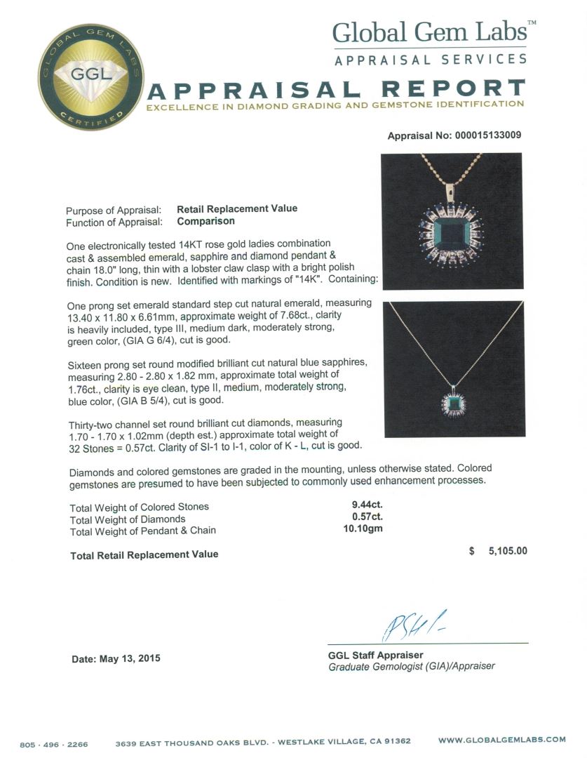 One electronically tested 14KT rose gold ladies combination cast & assembled emerald, sapphire and diamond pendant & chain 18.0" long, thin with a lobster claw clasp with a bright polish finish. Identified with markings of "14K". Condition is new. Containing: One prong set emerald standard step cut natural emerald, measuring 13.40 x 11.80 x 6.61mm, approximate weight of 7.68ct., clarity is heavily included, type III, medium dark, moderately strong, green color, (GIA G 6/4), cut is good. Sixteen prong set round modified brilliant cut natural blue sapphires, measuring 2.80 - 2.80 x 1.82 mm, approximate total weight of 1.76ct., clarity is eye clean, type II, medium, moderately strong, blue color, (GIA B 5/4), cut is good. Thirty-Two channel set round brilliant cut diamonds, measuring 1.70 - 1.70 x 1.02mm (depth est.) approximate total weight of 32 Stones = 0.57ct. Clarity: SI-1 to I-1. Color: K - L, Cut is Good. Diamonds and colored gemstones are graded in the mounting, unless otherwise stated. Colored gemstones are presumed to have been subjected to commonly used enhancement processes. Total Weight of Colored Stones 9.44ct. Total Weight of Diamonds 0.57ct. Total Weight of Pendant & Chain 10.10 grams. GGL Appraised at $5,105.00.