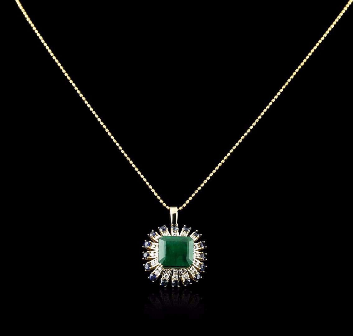 One electronically tested 14KT rose gold ladies combination cast & assembled emerald, sapphire and diamond pendant & chain 18.0" long, thin with a lobster claw clasp with a bright polish finish. Identified with markings of "14K". Condition is new. Containing: One prong set emerald standard step cut natural emerald, measuring 13.40 x 11.80 x 6.61mm, approximate weight of 7.68ct., clarity is heavily included, type III, medium dark, moderately strong, green color, (GIA G 6/4), cut is good. Sixteen prong set round modified brilliant cut natural blue sapphires, measuring 2.80 - 2.80 x 1.82 mm, approximate total weight of 1.76ct., clarity is eye clean, type II, medium, moderately strong, blue color, (GIA B 5/4), cut is good. Thirty-Two channel set round brilliant cut diamonds, measuring 1.70 - 1.70 x 1.02mm (depth est.) approximate total weight of 32 Stones = 0.57ct. Clarity: SI-1 to I-1. Color: K - L, Cut is Good. Diamonds and colored gemstones are graded in the mounting, unless otherwise stated. Colored gemstones are presumed to have been subjected to commonly used enhancement processes. Total Weight of Colored Stones 9.44ct. Total Weight of Diamonds 0.57ct. Total Weight of Pendant & Chain 10.10 grams. GGL Appraised at $5,105.00.