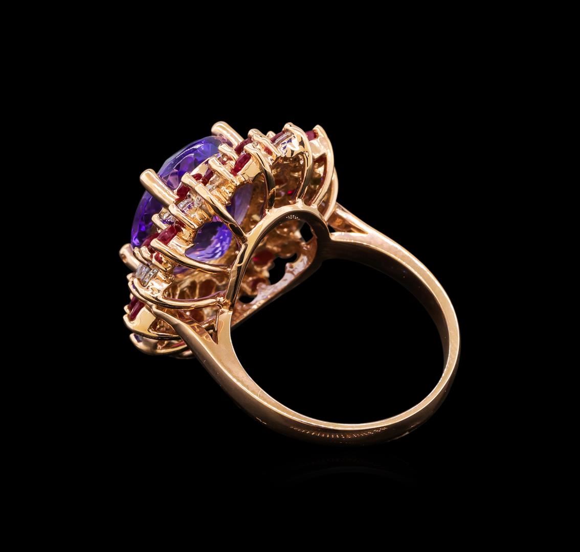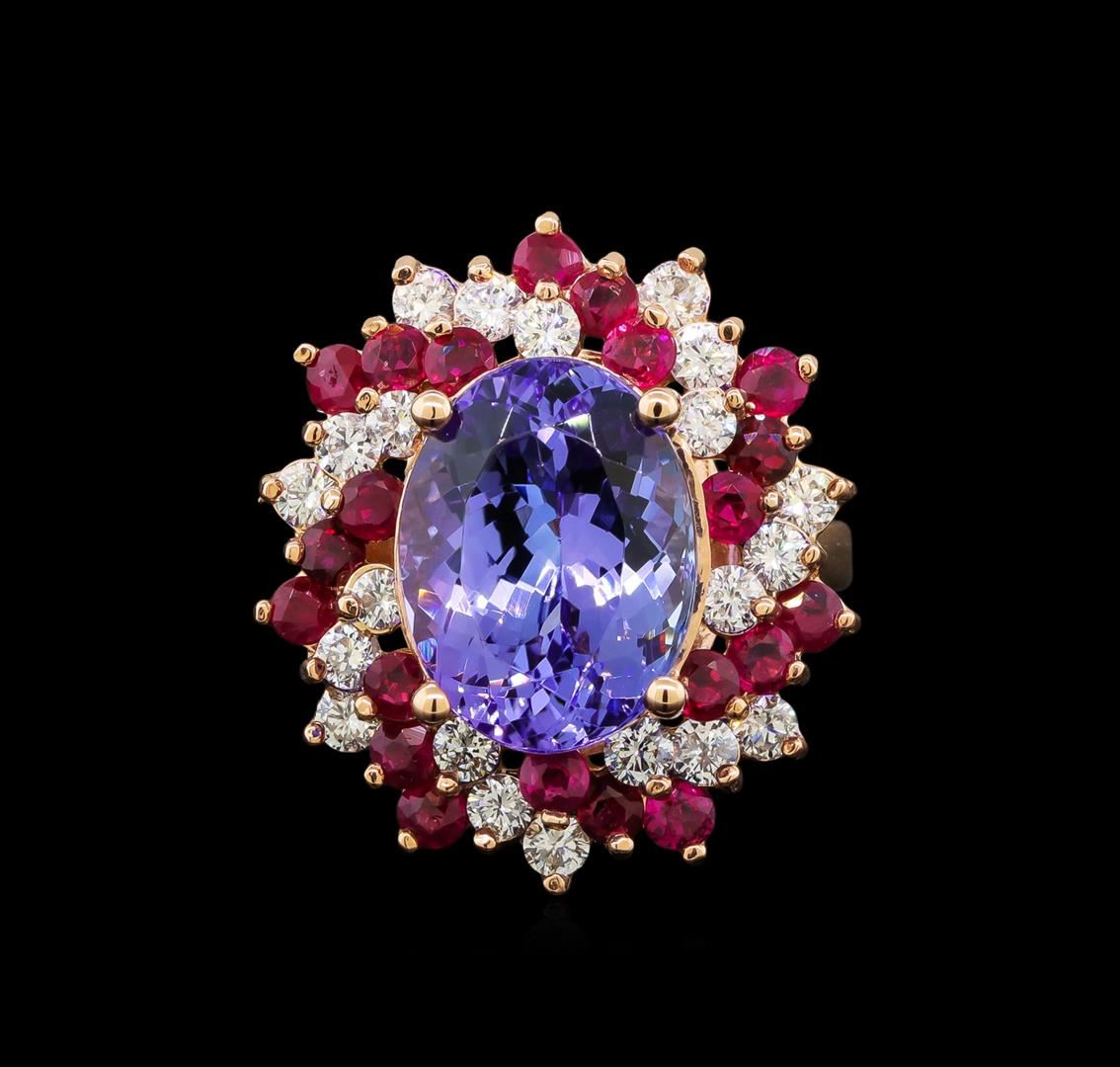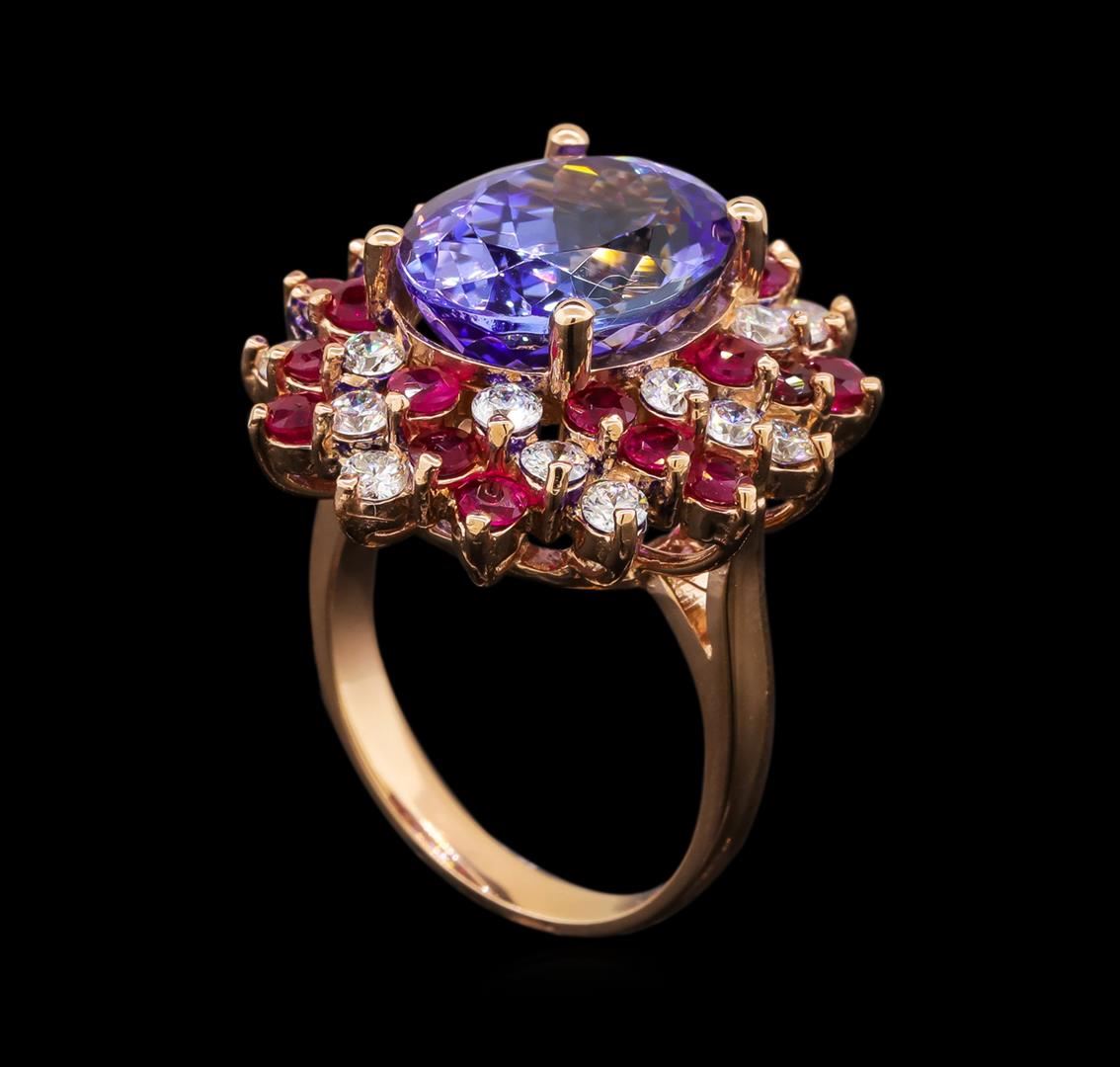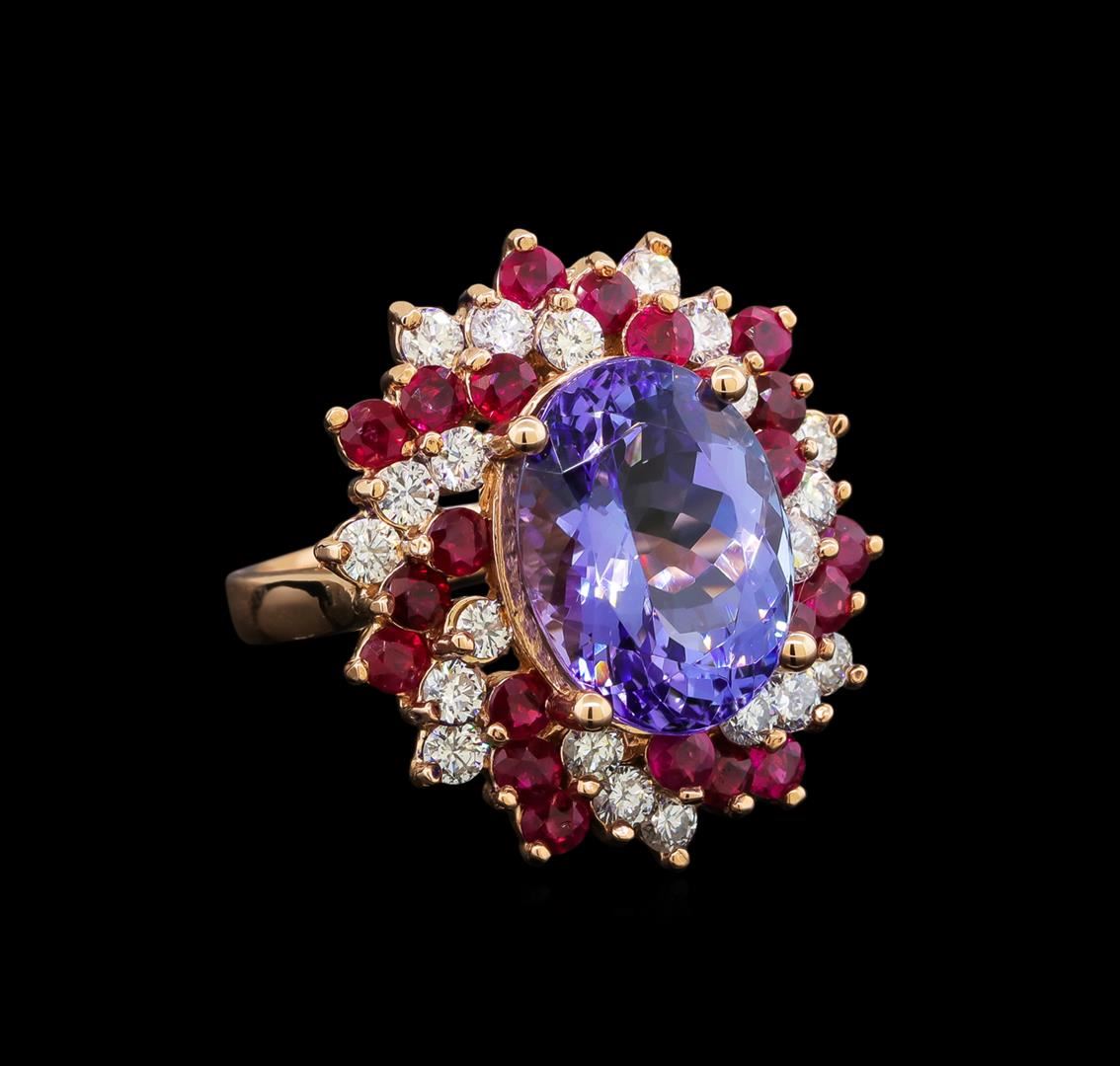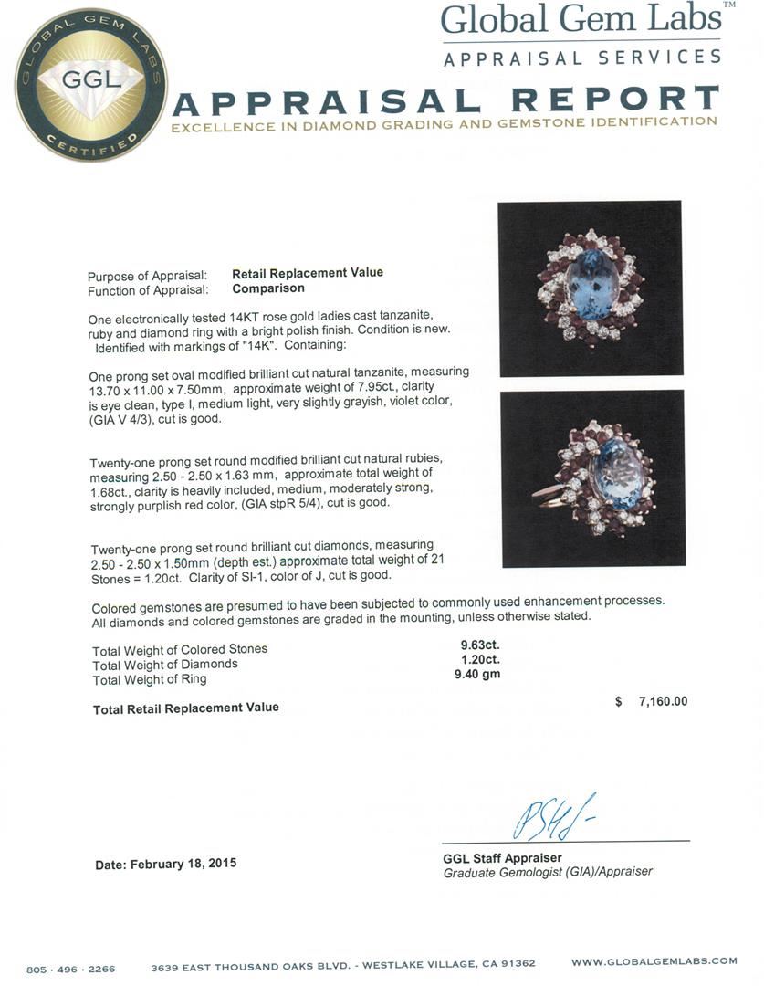 One electronically tested 14KT rose gold ladies cast tanzanite, ruby and diamond ring with a bright polish finish. Identified with markings of "14K". Condition is new. Containing: One prong set oval modified brilliant cut natural tanzanite, measuring 13.70 x 11.00 x 7.50mm, approximate weight of 7.95ct., clarity is eye clean, type I, medium light, very slightly grayish, violet color, (GIA V 4/3), cut is good. Twenty-one prong set round modified brilliant cut natural rubies, measuring 2.50 - 2.50 x 1.63 mm, approximate total weight of 1.68ct., clarity is heavily included, medium, moderately strong, strongly purplish red color, (GIA stpR 5/4), cut is good. Twenty-One prong set round brilliant cut diamonds, measuring 2.50 - 2.50 x 1.50mm (depth est.) approximate total weight of 21 Stones = 1.20 ct. Clarity: SI-1. Color: J, Cut is Good. Colored gemstones are presumed to have been subjected to commonly used enhancement processes. All diamonds and colored gemstones are graded in the mounting, unless otherwise stated. Total Weight of Colored Stones 9.63ct. Total Weight of Diamonds 1.20 ct. Total Weight of Ring 9.40 grams. GGL Appraised.