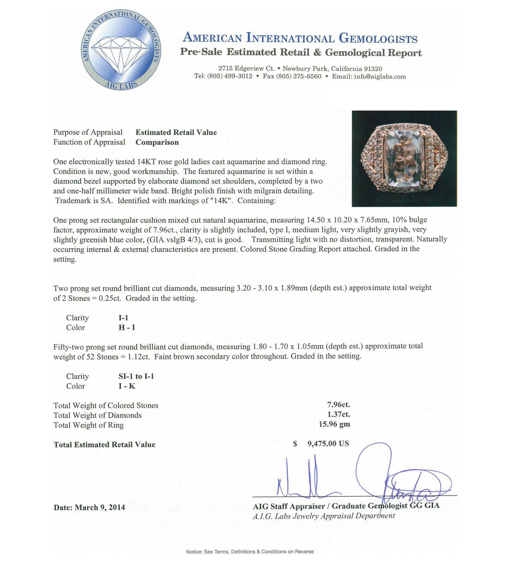 One electronically tested 14KT rose gold ladies cast aquamarine and diamond ring. The featured aquamarine is set within a diamond bezel supported by elaborate diamond set shoulders, completed by a two and one-half millimeter wide band. Bright polish finish with milgrain detailing. Trademark is SA. Identified with markings of "14K". Condition is new, good workmanship. Containing: One prong set rectangular cushion mixed cut natural aquamarine, measuring 14.50 x 10.20 x 7.65mm, 10%. bulge factor, approximate weight of 7.96ct., clarity is slightly included, type I, medium light, very slightly grayish, very slightly greenish blue color, (GIA vslgB 4/3), cut is good. Transmitting light with no distortion, transparent. Naturally occurring internal & external characteristics are present. Colored Stone Grading Report attached. Graded in the setting. Two prong set round brilliant cut diamonds, measuring 3.20 - 3.10 x 1.89mm (depth est.) approximate. Total Weight of 2 Stones = 0.25ct. Graded in the setting. Clarity: I-1. Color: H - I Fifty-Two prong set round brilliant cut diamonds, measuring 1.80 - 1.70 x 1.05mm (depth est.) approximate. Total Weight of 52 Stones = 1.12ct. Faint brown secondary color throughout. Graded in the setting. Clarity: SI-1 to I-1. Color: I - K. Total Weight of Colored Stones 7.96ct. Total Weight of Diamonds 1.37ct. AIG Appraised at $9,475.00.