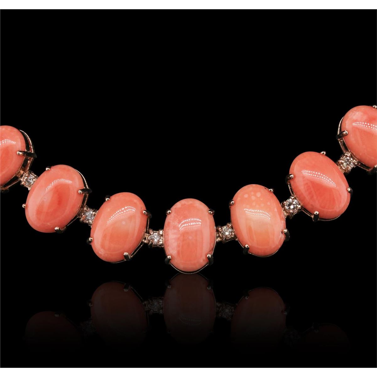 One electronically tested 14KT rose gold ladies cast & assembled coral and diamond necklace. Condition is new, good workmanship. Eighteen inch length necklace features a flexible tapering coral and diamond ribbon, terminating in a concealed clasp with safety. Bright polish finish. Identified with markings of ""14K"". Containing: Seven prong set oval cabochon cut natural salmon corals, measuring 14.00 x 10.00 x 4.35mm, 5% bulge factor, approximate total weight of 32.16ct., clarity is severely included, medium dark, very slightly brownish, reddish orange color, (GIA rO 6/3), cut is good. Transmitting light very diffusely, opaque. Naturally occurring internal & external characteristics are present. Measurements & the color grade are an average for the group. Graded in the setting. Fourteen prong set oval cabochon cut natural salmon corals, measuring 10.00 x 7.80 x 3.20mm, 5% bulge factor, approximate total weight of 26.42ct., clarity is severely included, medium dark, very slightly brownish, reddish orange color, (GIA rO 6/3), cut is good. Transmitting light very diffusely, opaque. Naturally occurring internal & external characteristics are present. Measurements & the color grade are an average for the group. Graded in the setting. Twenty-two prong set oval cabochon cut natural salmon corals, measuring 7.60 x 6.00 x 2.50mm, 5% bulge factor, approximate total weight of 18.92ct., clarity is severely included, medium dark, very slightly brownish, reddish orange color, (GIA rO 6/3), cut is good. Transmitting light very diffusely, opaque. Naturally occurring internal & external characteristics are present. Measurements & the color grade are an average for the group. Graded in the setting. Salmon Coral is formed undersea by microscopic animals called coral polyps. These tiny, creatures form minute, hard shells. As a colony grows, it takes on complex branching, tree-like forms which allows the maximum number of polyps to be fed by the nutrients in the water. It grows about one quarter inch per year. This color of coral is commonly treated to improve or change the color and stability. Evidence that may confirm this is typically lacking. Forty-Two prong set round brilliant cut diamonds, measuring 2.50 - 2.40 x 1.47mm (depth est.) approximate total weight of 42 Stones = 2.35ct. Graded in the setting. Clarity SI-2 to I-2 Color G - I Total Weight of Colored Stones 77.50 ct. Total Weight of Diamonds 2.35 ct. Total Weight of Necklace 64.06 grams AIG Appraised at $37,615.00.
