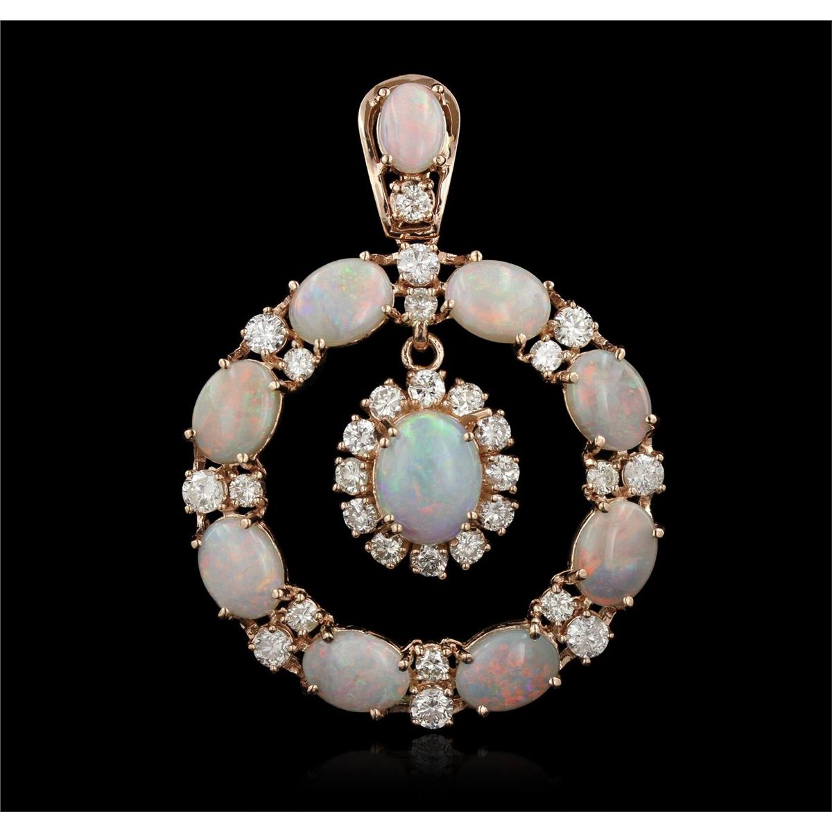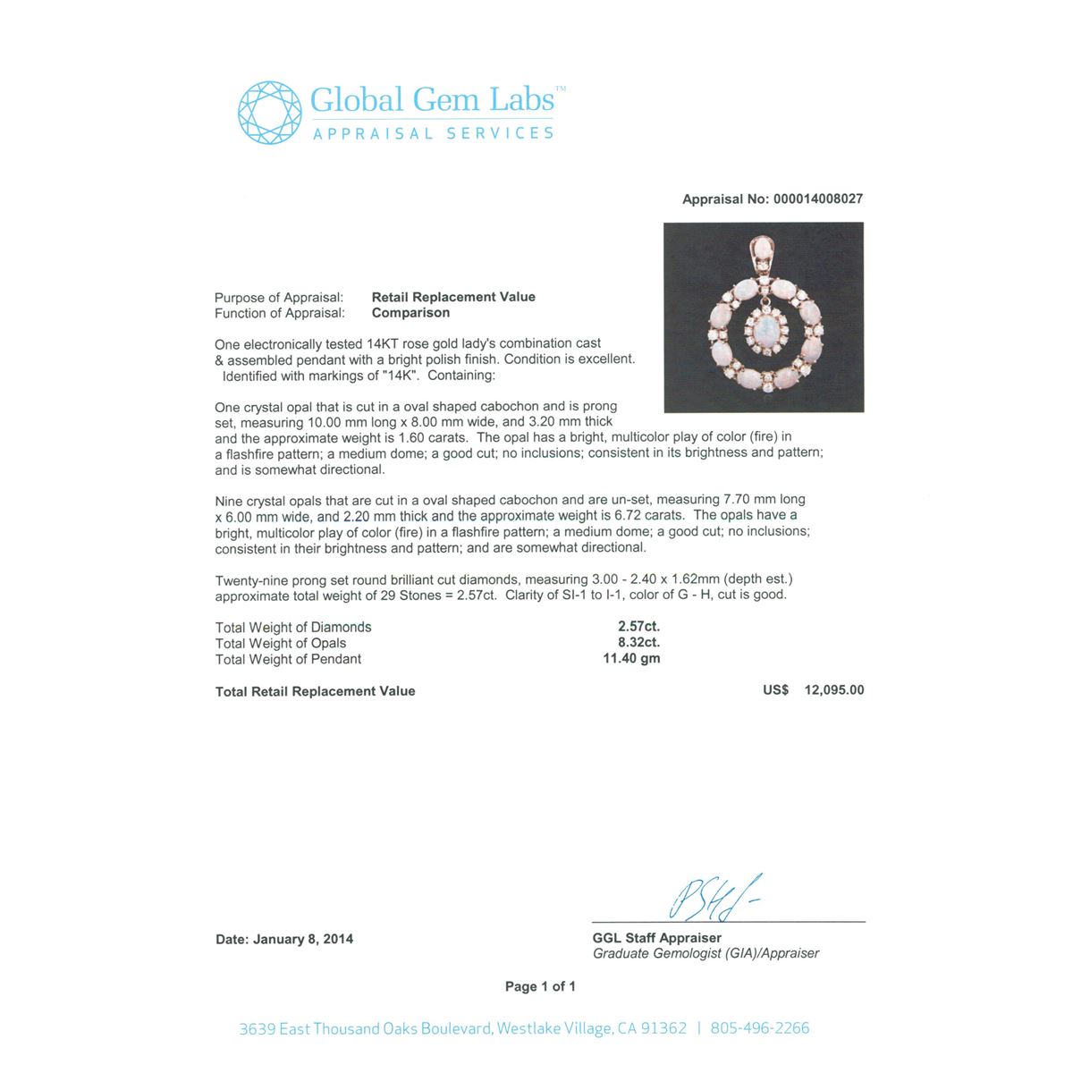 One electronically tested 14KT rose gold Ladies combination cast & assembled pendant with a bright polish finish. Identified with markings of "14K". Condition is excellent. Containing: One crystal opal that is cut in a oval shaped cabochon and is prong set, measuring 10.00 mm long x 8.00 mm wide, and 3.20 mm thick and the approximate weight is 1.60 carats. The opal has a bright, multicolor play of color (fire) in a flash fire pattern; a medium dome; a good cut; no inclusions; consistent in its brightness and pattern; and is somewhat directional. Nine crystal opals that are cut in a oval shaped cabochon and are un-set, measuring 7.70 mm long x 6.00 mm wide, and 2.20 mm thick and the approximate weight is 6.72 carats. The opals have a bright, multicolor play of color (fire) in a flash fire pattern; a medium dome; a good cut; no inclusions; consistent in their brightness and pattern; and are somewhat directional. Twenty-Nine prong set round brilliant cut diamonds, measuring 3.00 - 2.40 x 1.62mm (depth est.) approximate total weight of 29 Stones = 2.57ct. Clarity of SI-1 to I-1, Color of G - H, Cut is Good. Total Weight of Diamonds 2.57ct. Total Weight of Opals 8.32ct. Total Weight of Pendant 11.40gm. GGL Appraised at $12,095.00.